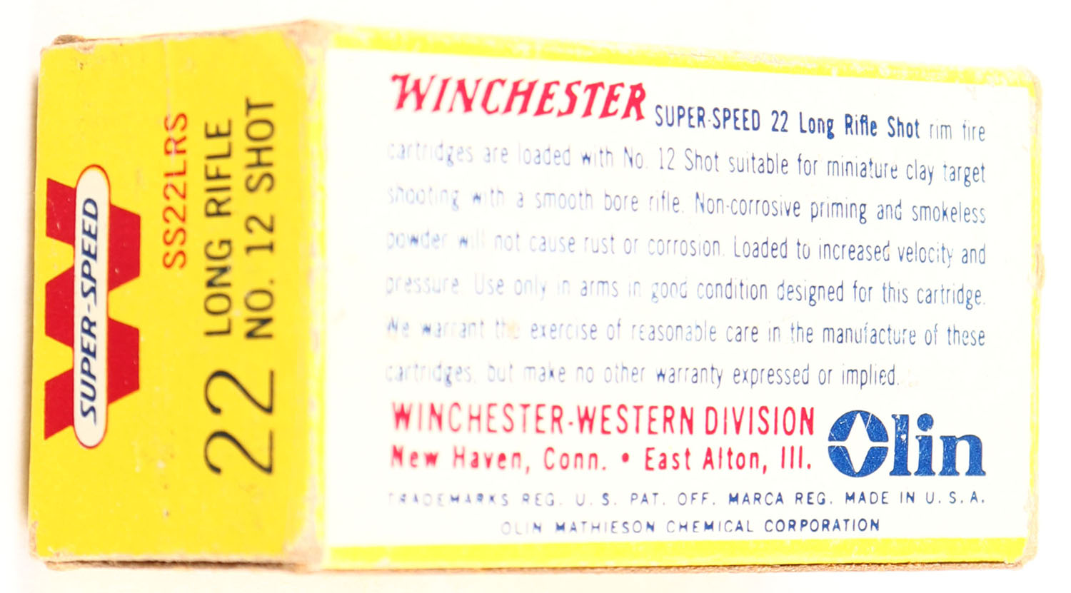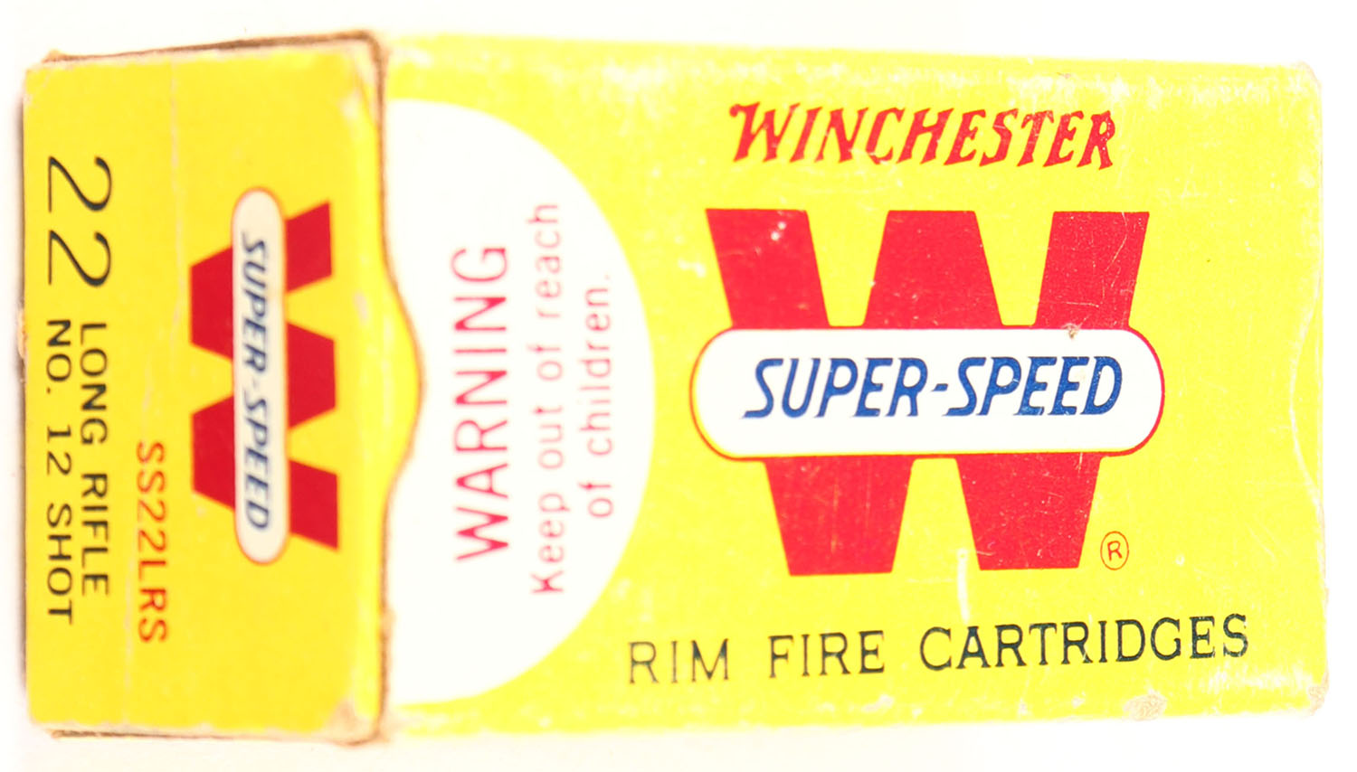 Winchester, Super-Speed, .22 Long Rifle Shot, No. 12 Shot, RHWeb: WRA-20 LR-6, Full, 1pc. Yellow white & red box, box is solid with minty color, minor edge & corner wear, end flaps are solid, ammo is minty. Grade: Excellent + - Value: 10 to 50