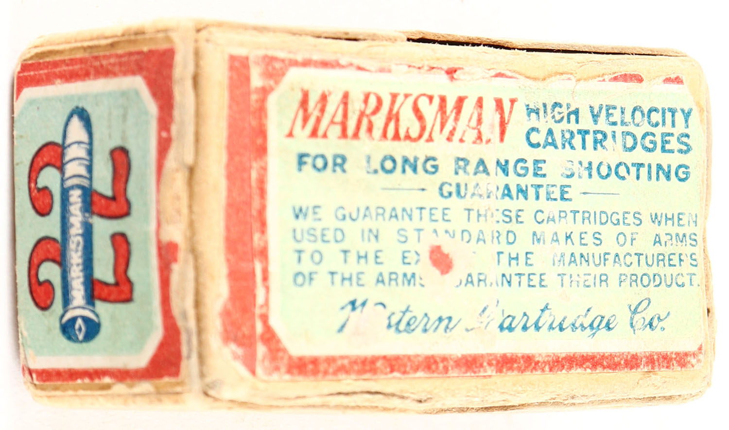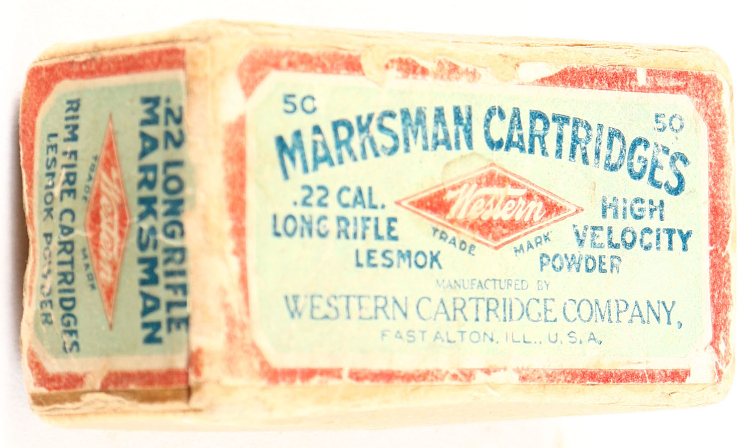 Western, Marksman Cartridges, .22 Long Rifle, Lesmok Powder, RHWeb: WCC-50 LR-2.5, Full, 2pc. Buff box with green/gray & red wraparound label, box is solid with good color, shelf wear, minor color fading, edge & corner wear, front and back sides have been written on, label is intact, ammo is good. Grade: Good ++ - Value: 30 to 90