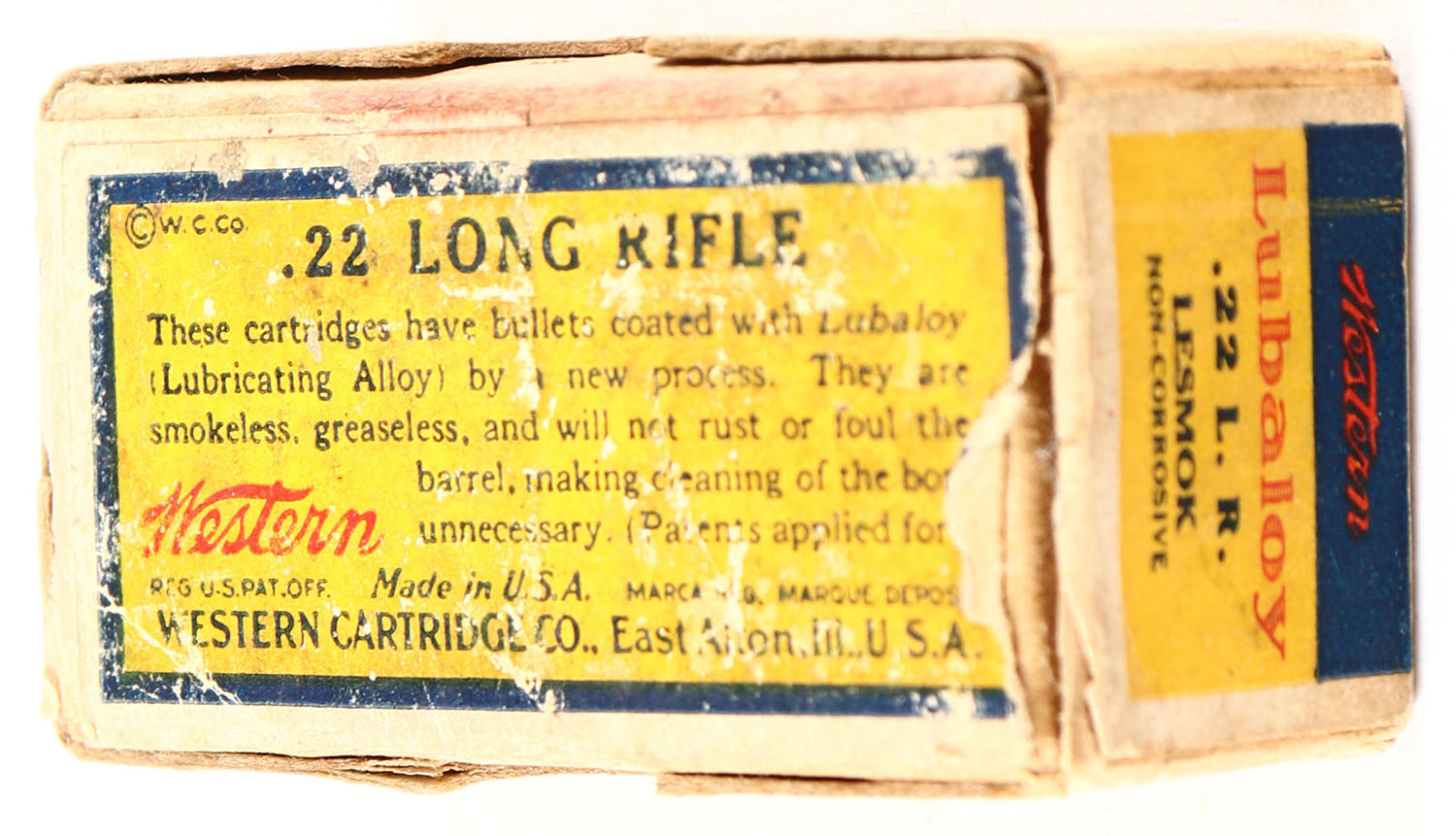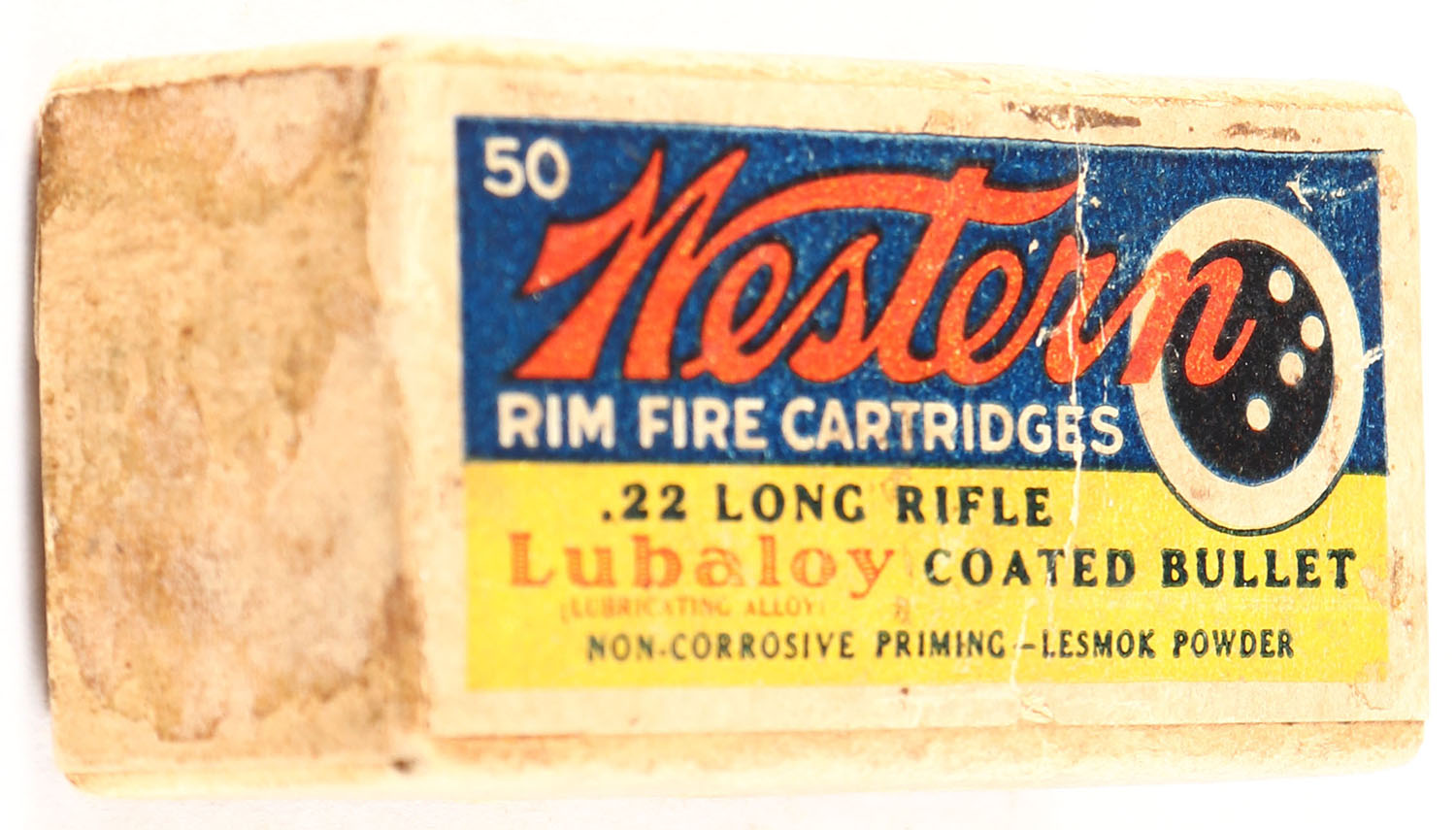 Western, Rim Fire Cartridges, .22 Long Rifle, Lubaloy Coated Bullet, RHWeb: WCC-4.2 LR-1, Full, 1pc. Buff box with blue yellow & red bulls eye wraparound label, box is solid with good to very good color, age soiling, some staining, minor edge & corner wear, some shelf wear, label missing from left end, ammo is very good to excellent. Grade: Very Good - Value: 30 to 90