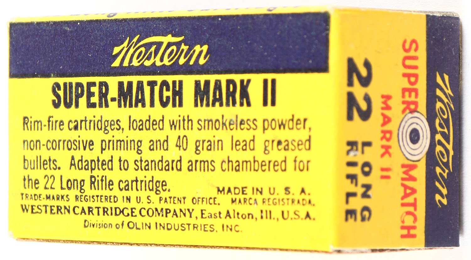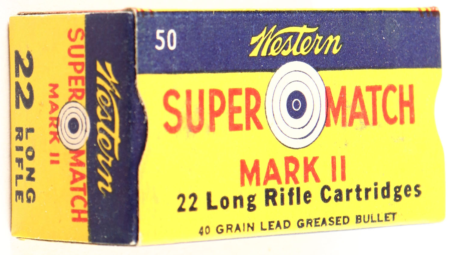 Western, Super Match Mark II, .22 Long Rifle, RHWeb: WCC-51.2 LR-3g, Full, 1pc. Yellow blue & red box, box is near mint with minty color, only very minor color bleeding, corners are sharp, edges are crisp, end flaps are solid, ammo is excellent. Grade: Excellent + - Value: 10 to 50