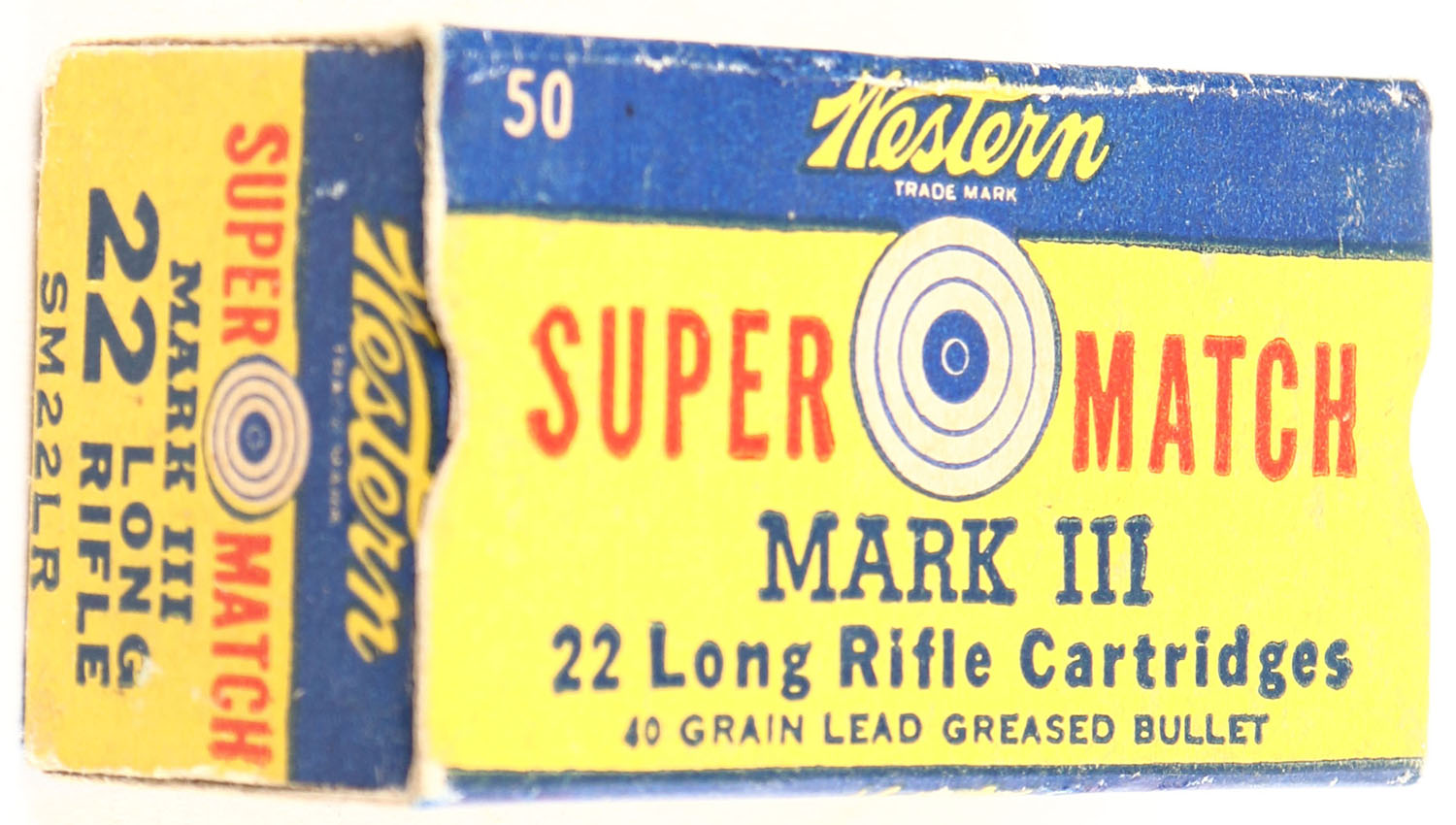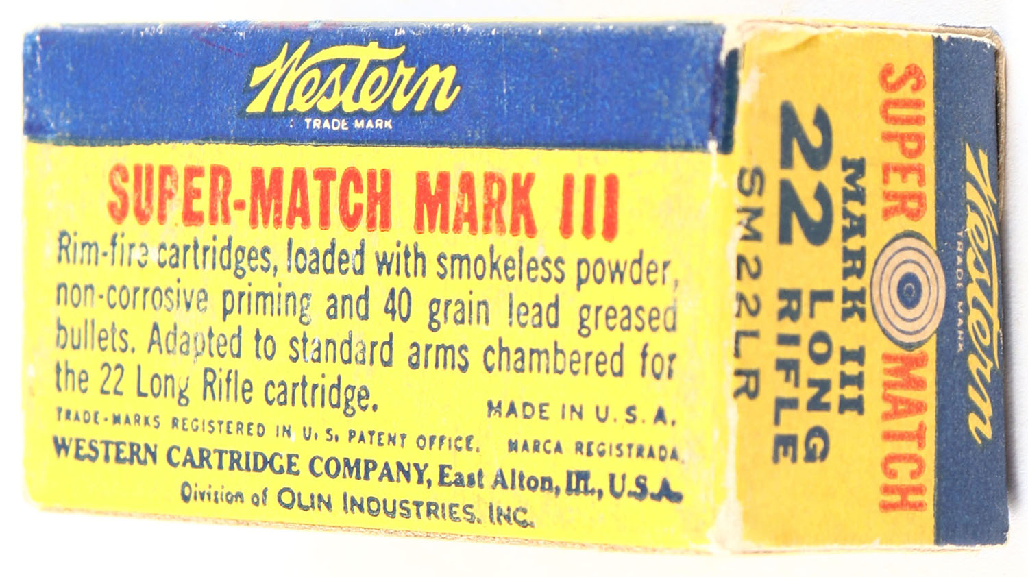 Western, Super Match Mark III, .22 Long Rifle, RHWeb: WCC-51.3 LR-1c, Full, 1pc. Yellow blue & red box, box is solid with excellent color, very minor age soiling & shelf wear, corners are mostly sharp, edges are mostly crisp, end flaps are solid, ammo is excellent to minty. Grade: Excellent + - Value: 10 to 50