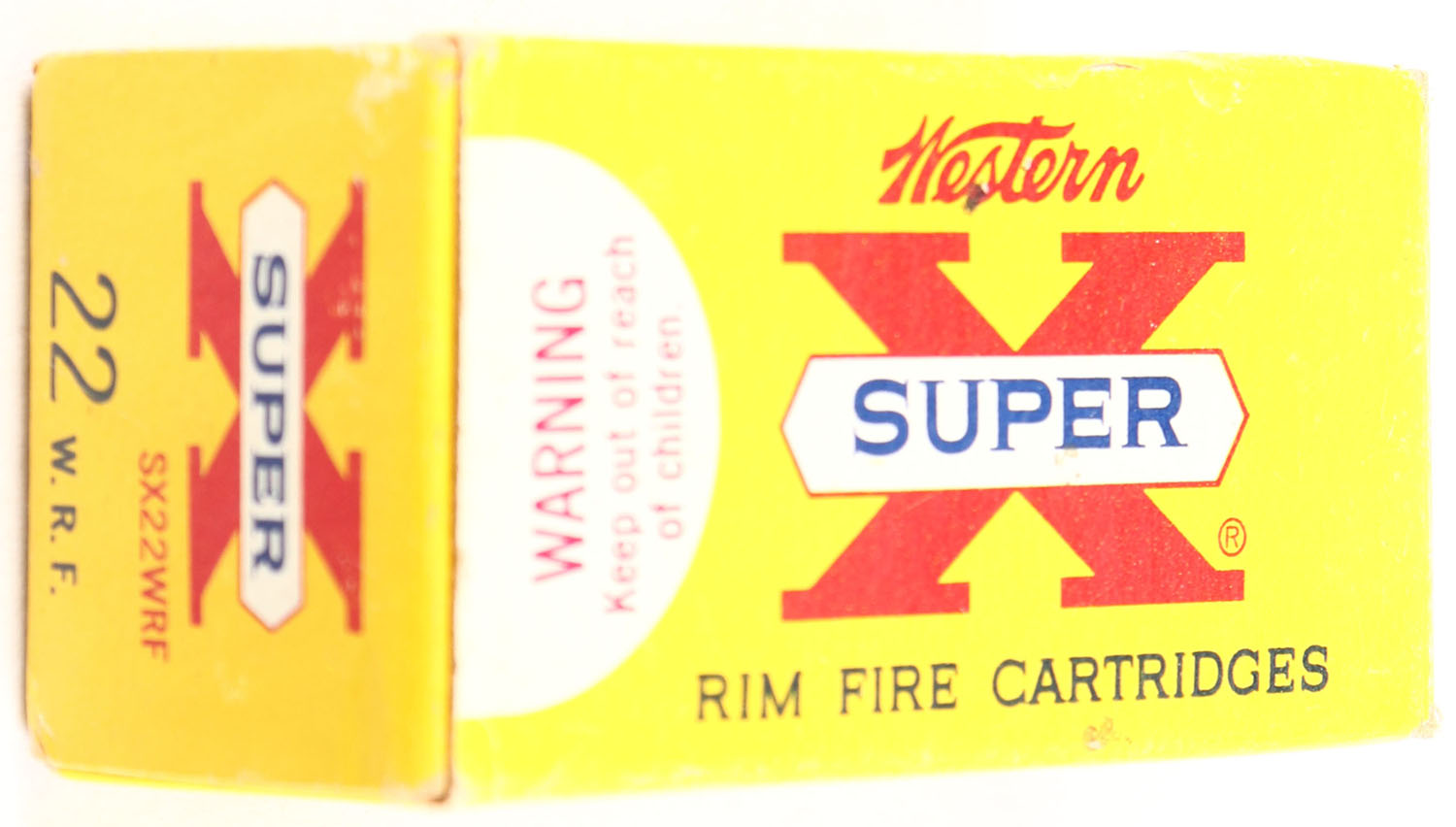 Western, Super X, .22 W.R.F., 45 Grain Lubaloy Coated Bullet, RHWeb: WCC-12 WRF-1b, Full, 1pc. Yellow white & red box, box is solid with excellent color, minor edge & corner wear, bottom is dirty, end flaps are solid, ammo is minty. Grade: Excellent - Value: 8 to 40