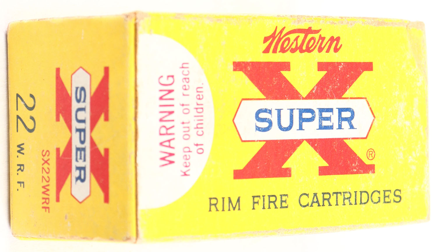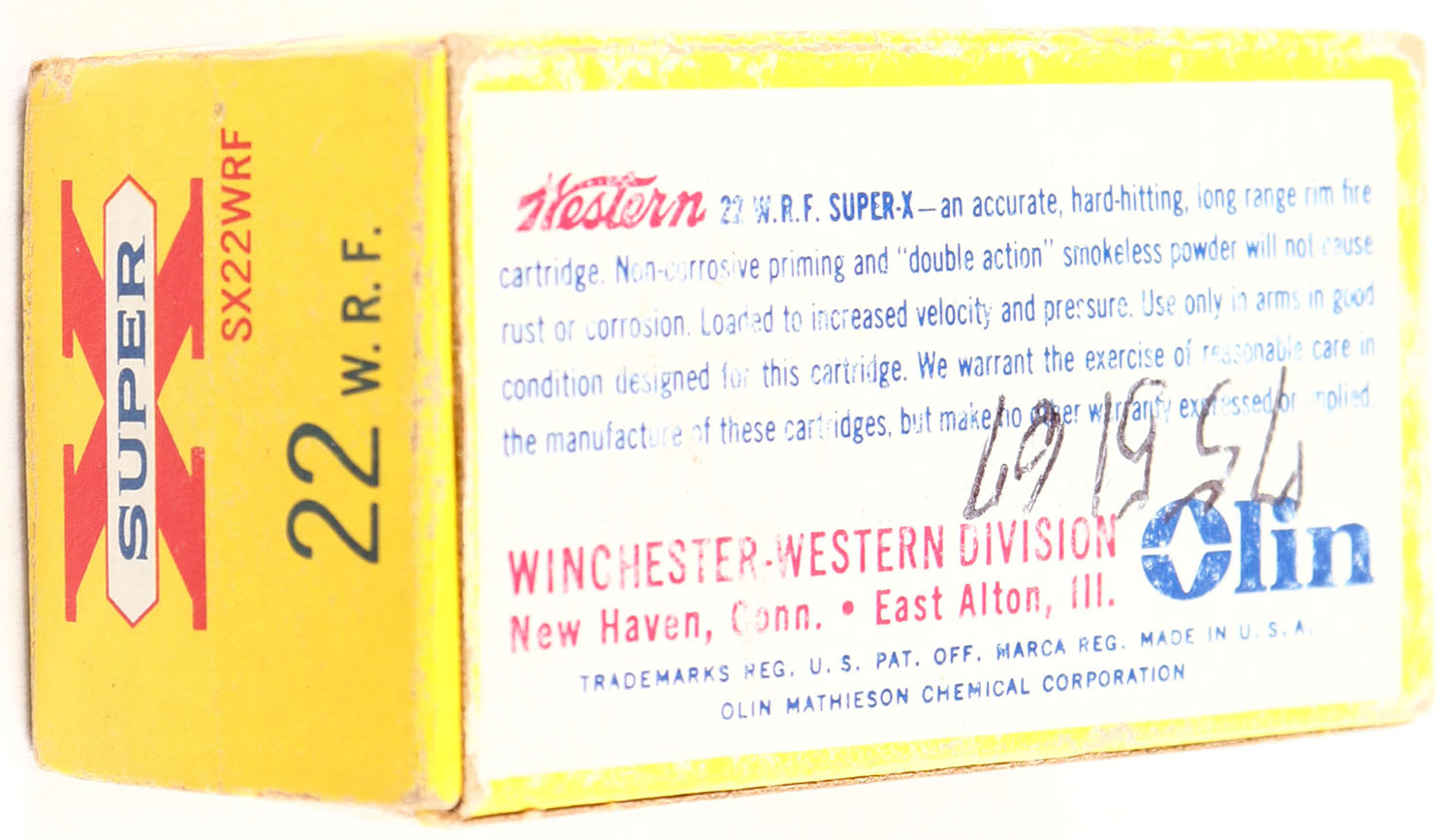 Western, Super X, .22 W.R.F., 45 Grain Lubaloy Coated Bullet, RHWeb: WCC-12 WRF-1b, Full, 1pc. Yellow white & red box, box is solid with very good color, some shelf wear, some edge & corner wear, bottom has been written on, end flaps are solid, ammo is excellent to minty. Grade: Very Good ++ - Value: 8 to 40