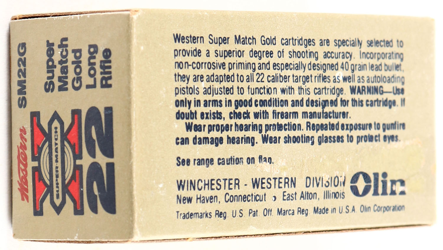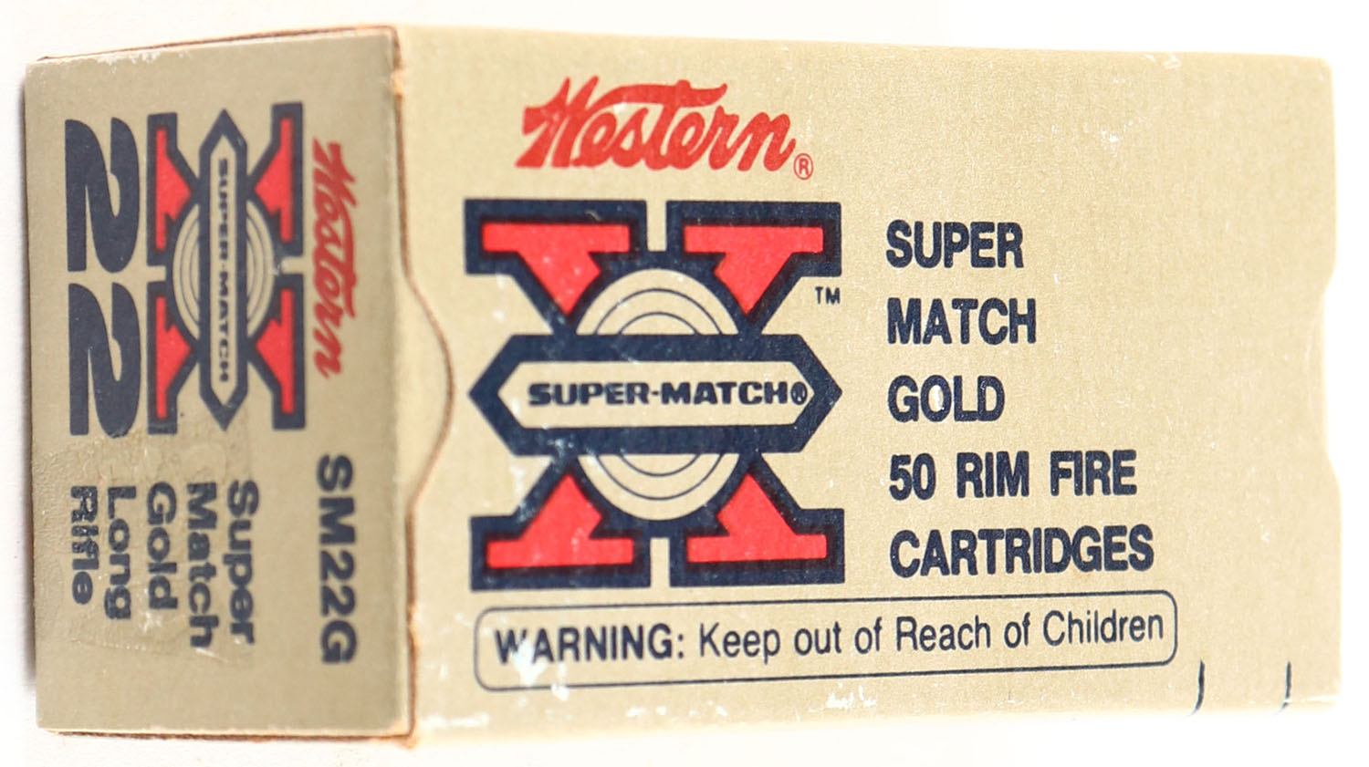 Western, Super-Match Gold, .22 Long Rifle, Special Match Bullet, RHWeb: WCC-51.5 LR-2, Full, 1pc. Gold black & red box, box is solid with excellent color, very minor shelf wear, tape residue on left end & bottom, corners are mostly sharp, edges are crisp, end flaps are solid, ammo is excellent. Grade: Excellent - Value: 6 to 30