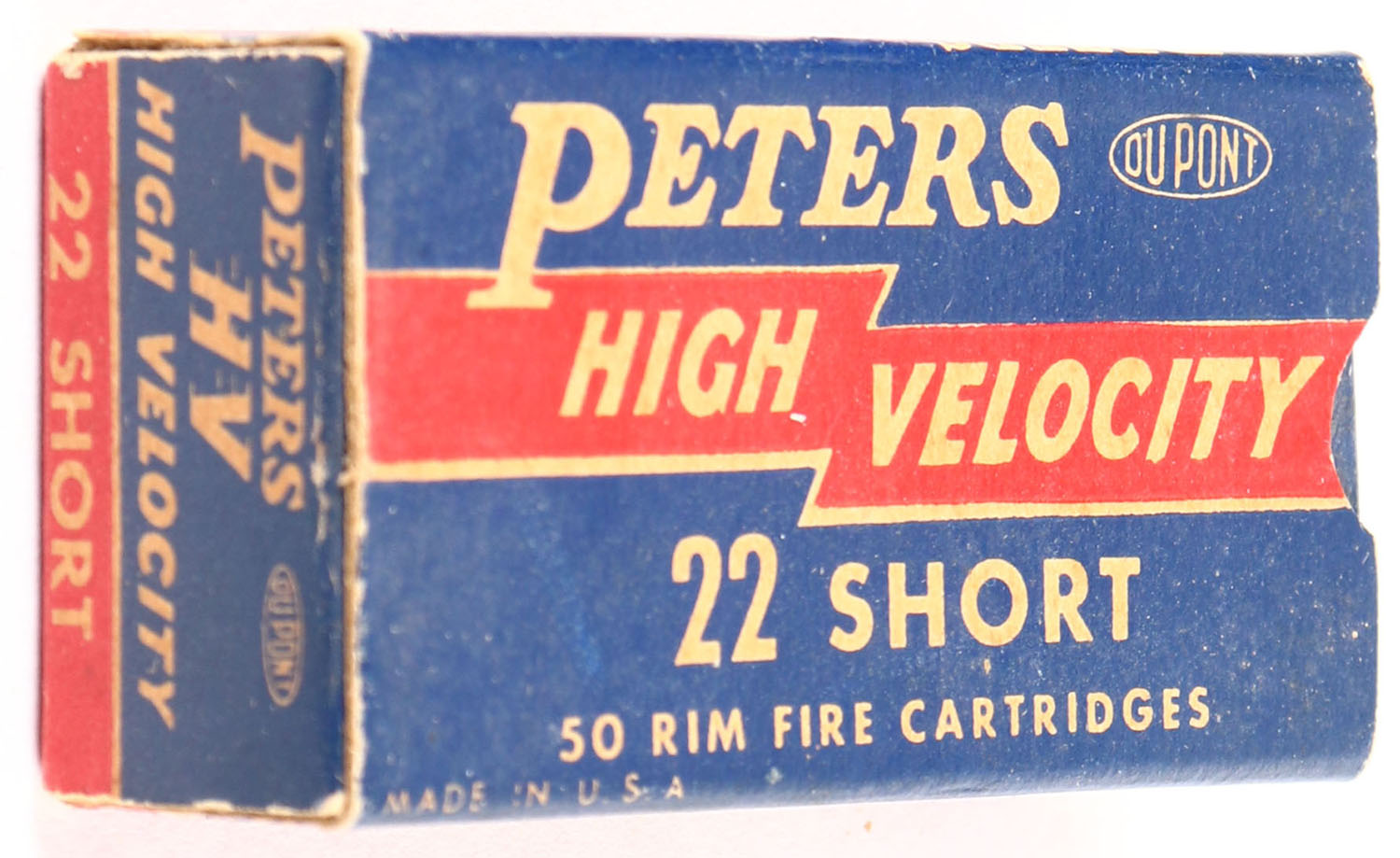 Peters, High Velocity, .22 Short, RHWeb: PCC-17 S-1a, Full, 1pc. Blue red & white box, box is solid with very good color, some age soiling, very minor corner wear, edges are crisp, end flaps are solid, ammo is excellent. Grade: Excellent - Value: 8 to 40