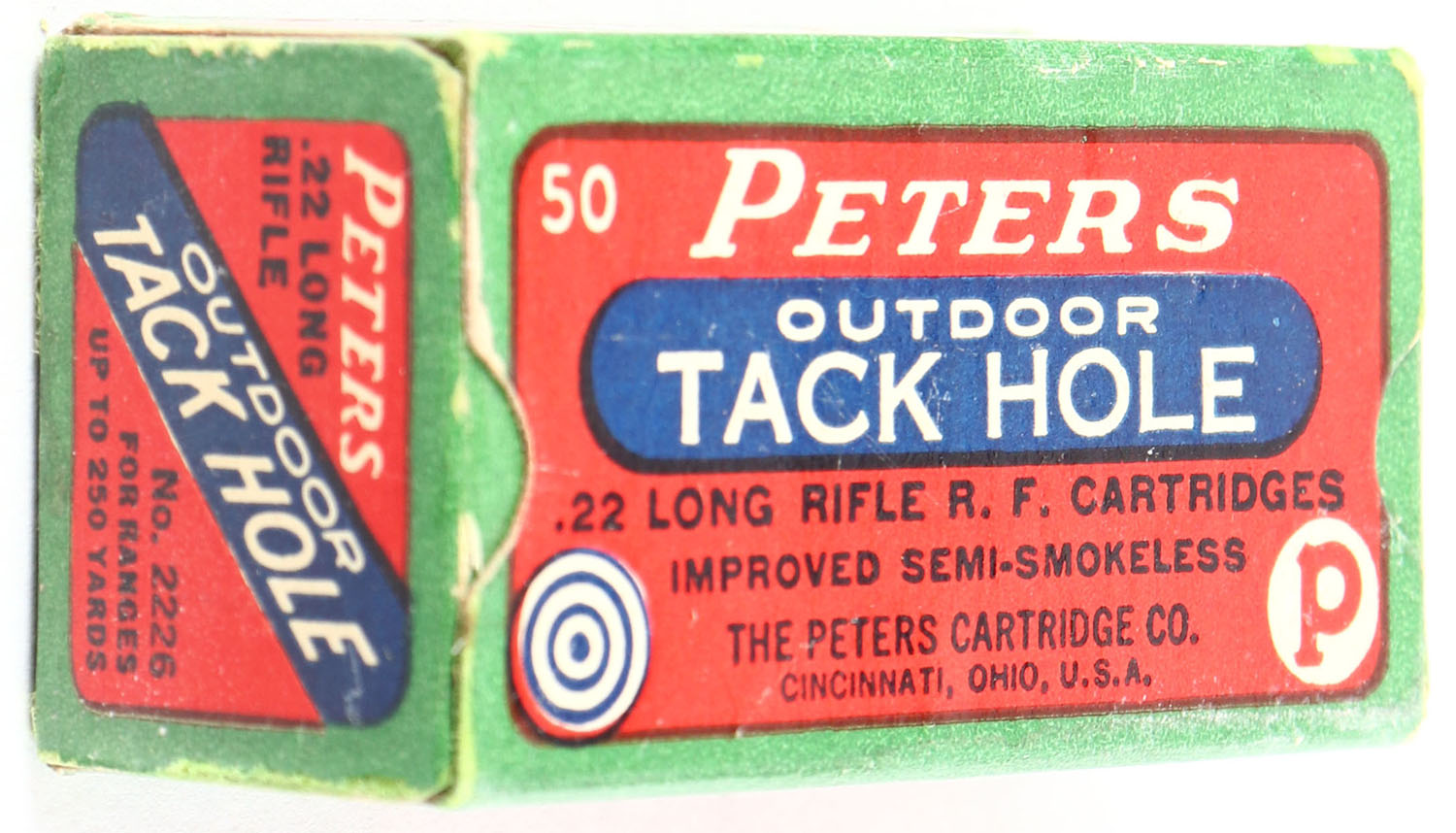 Peters, Outdoor Tack Hole, .22 Long Rifle, Improved Semi-Smokeless, Cincinnati, RHWeb: PCC-52 LR-9, Full, 1pc. Red green & blue box, box is solid with excellent to minty color, minor corner wear, very minor edge wear, end flaps are solid, ammo is very good. Grade: Excellent + - Value: 50 to 150