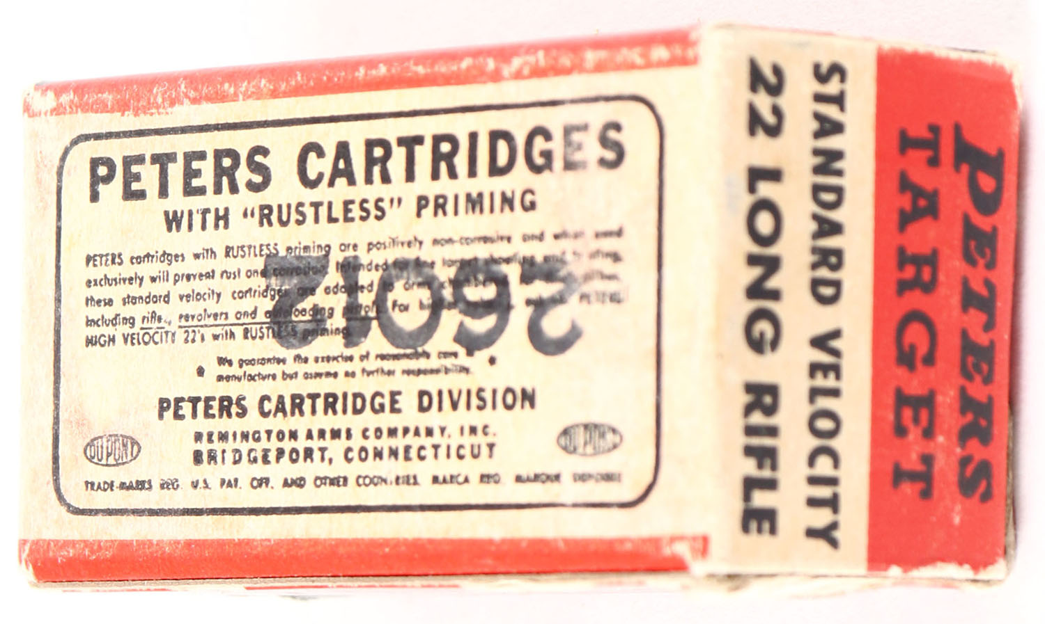 Peters, Target, .22 Long Rifle, Standard Velocity, RHWeb: PCC-54C LR-2.2a, Full, 1pc. Red black & white box, box is solid with very good color, shelf wear, some edge & corner wear, end flaps are solid, ammo is excellent. Grade: Very Good ++ - Value: 4 to 20
