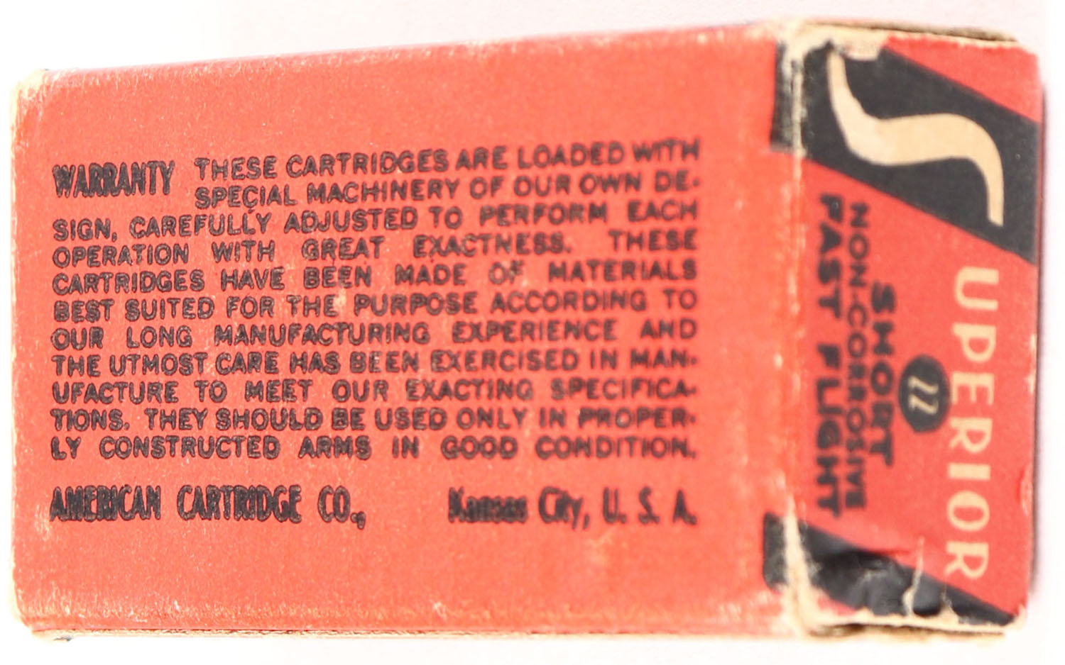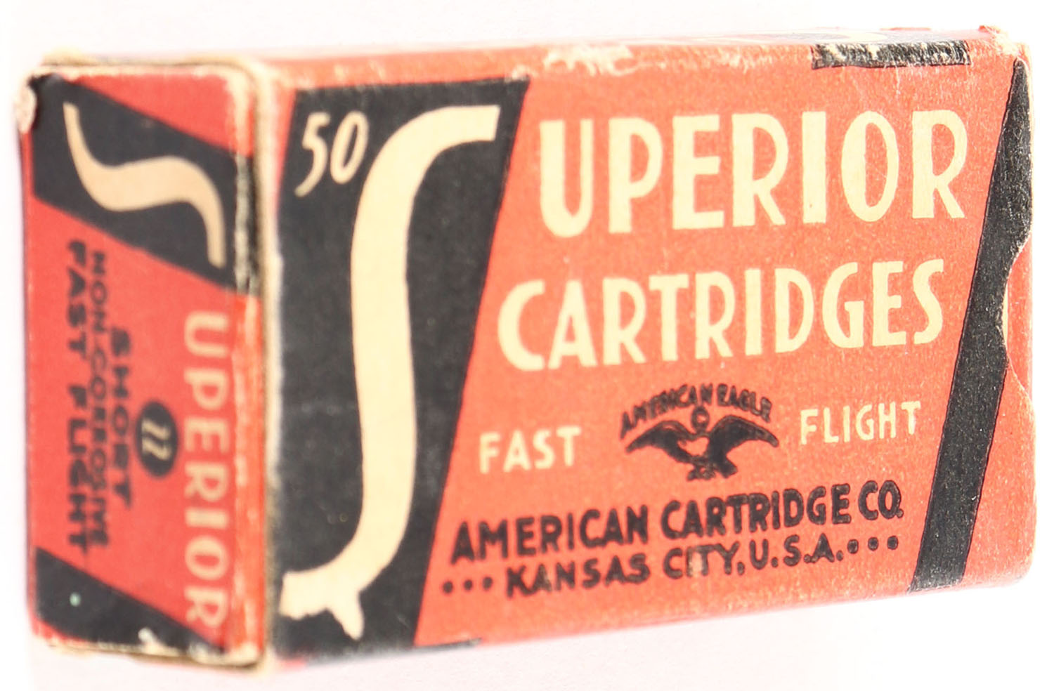 American, Superior Cartridges, .22 Short, Fast Flight, RHWeb: ACC-2 S-1c, Partial 33rds., 1pc. Red black & white box, box is solid with very good color, some age soiling, minor corner wear, edges are mostly crisp, end flaps are solid, ammo is excellent. Grade: Very Good ++ - Value: 6 to 30