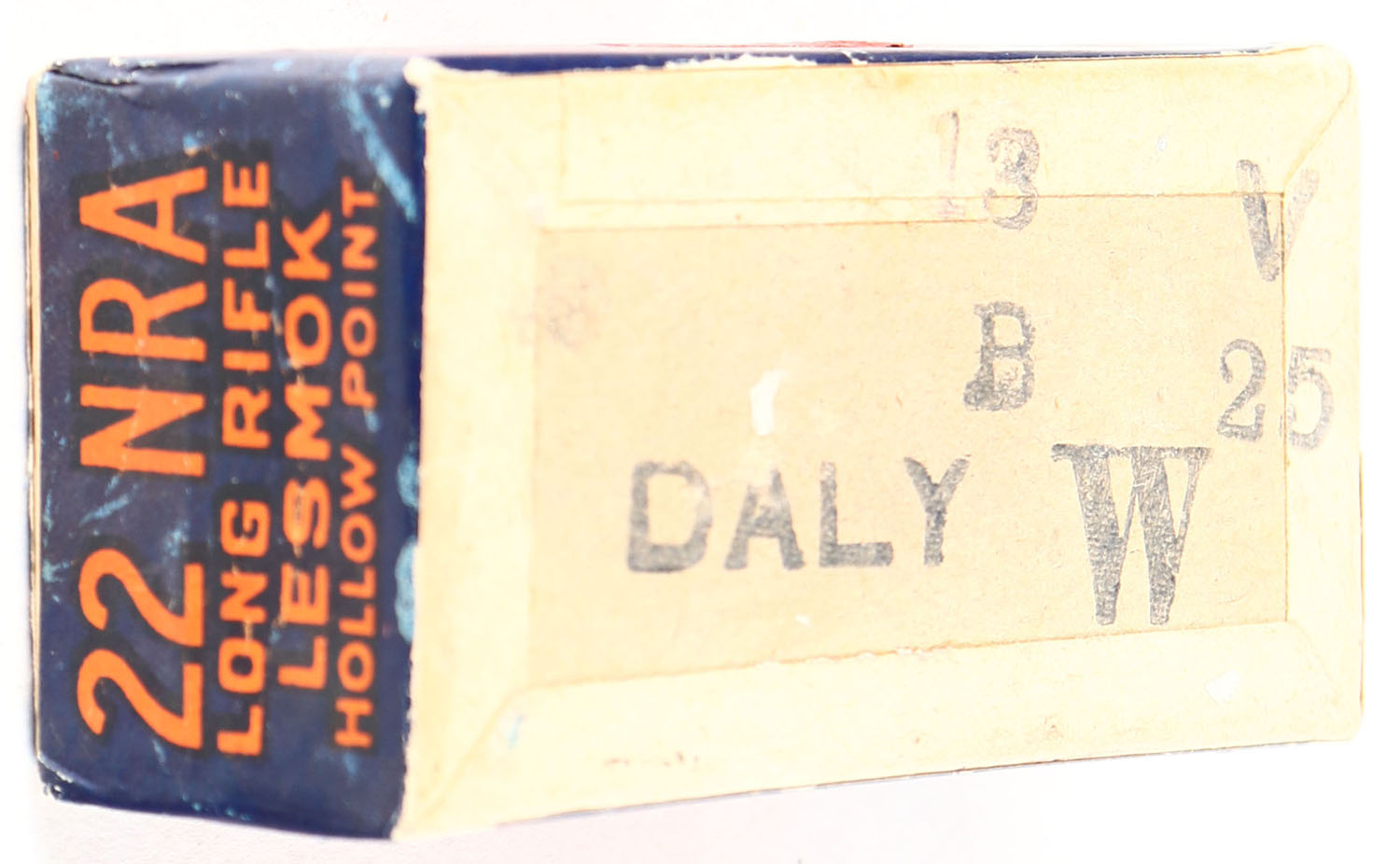 U.S., 22 NRA, .22 Long Rifle Hollow Point, Lesmok, RHWeb: US-51 LR-4b, FULL & SEALED, 2pc. Buff box with blue/orange top & side sealing labels with red ''Outdoor Cartridges'' over-label, box is solid with very good to excellent color, some color repairs on edges, corners are mostly sharp, edges are crisp, over-label is 95% intact. Grade: Excellent + - Value: 20 to 60
