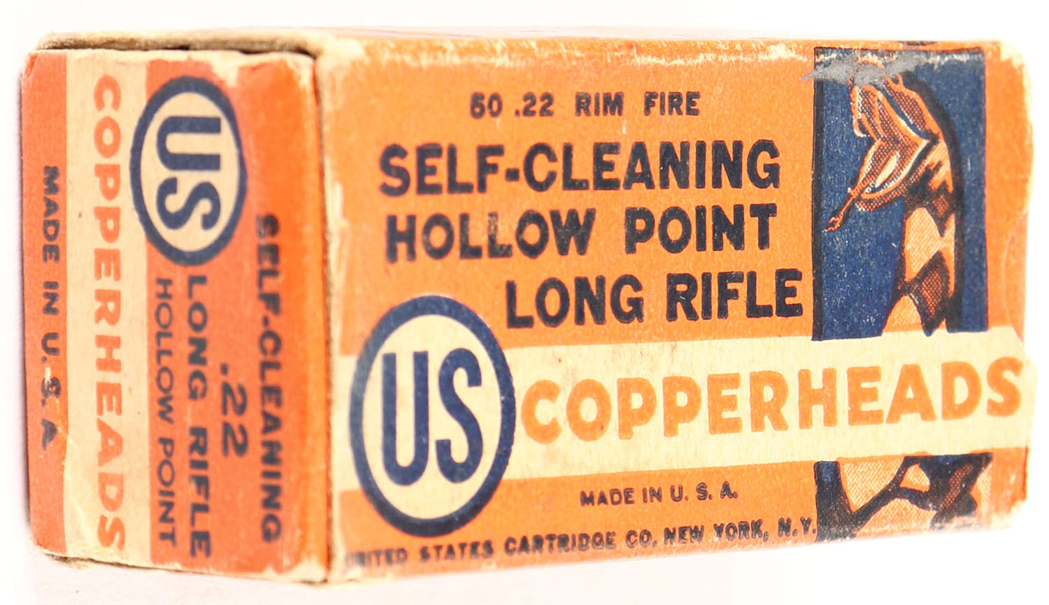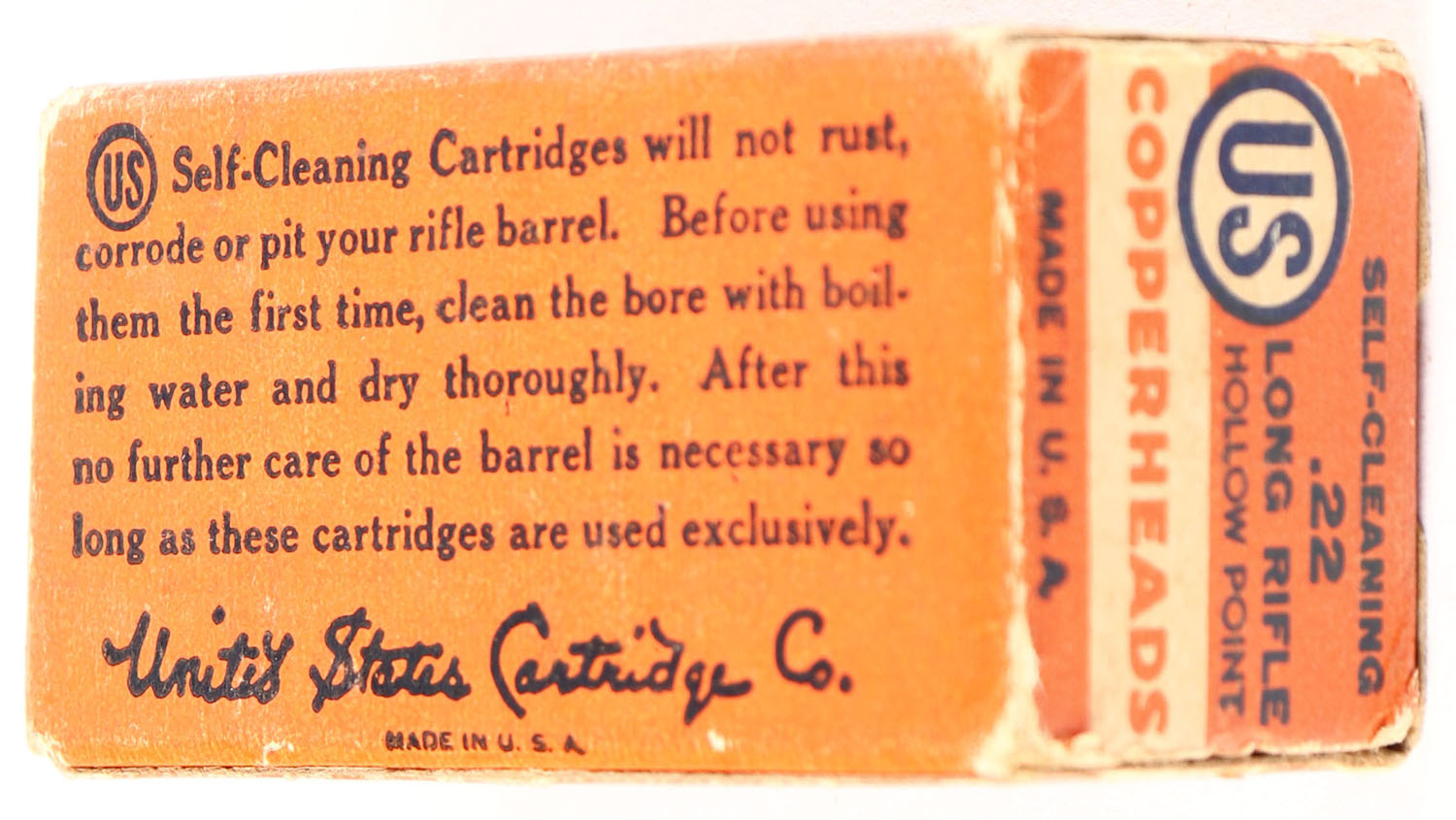 U.S., Self-Cleaning Copperheads, .22 Long Rifle Hollow Point, RHWeb: US-12 LR-3c, Full, 1pc. Orange black & white box, box is solid with very good color, minor age soiling & corner wear, edges are mostly crisp, end flaps are solid, ammo is excellent. Grade: Very Good + - Value: 10 to 50