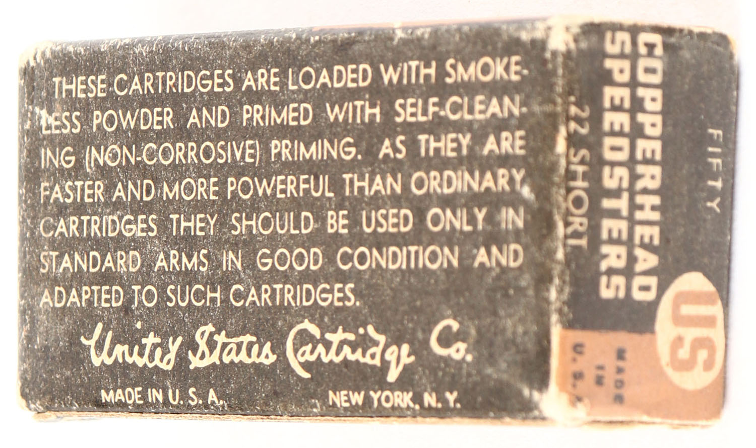 U.S., Copperhead Speedsters, .22 Short, RHWeb: US-13 S-1e, Full, 1pc. Black & bronze box, box is solid with very good color, some age soiling & color fading, minor corner wear, edges are mostly crisp, end flaps are solid, ammo is excellent. Grade: Very Good + - Value: 10 to 50