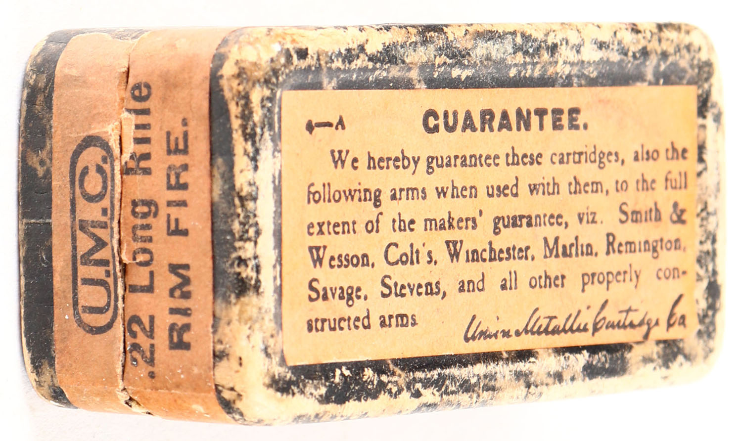 UMC, Rim Fire Cartridges, .22 Long Rifle, RHWeb: UMC-8 LR-3c, Partial 35rds., 2pc. Black mottled box with buff top & side sealing labels, box is solid with very good color, some age soiling, some edge & corner wear, side sealing label is 70% intact, ammo is fair. Grade: Very Good - Value: 10 to 50