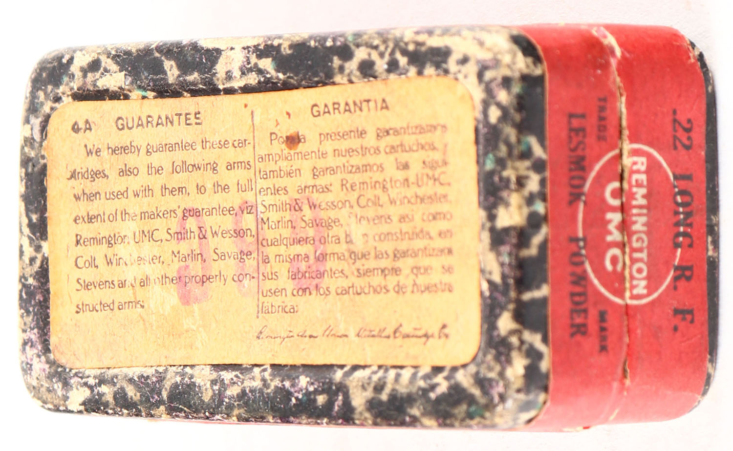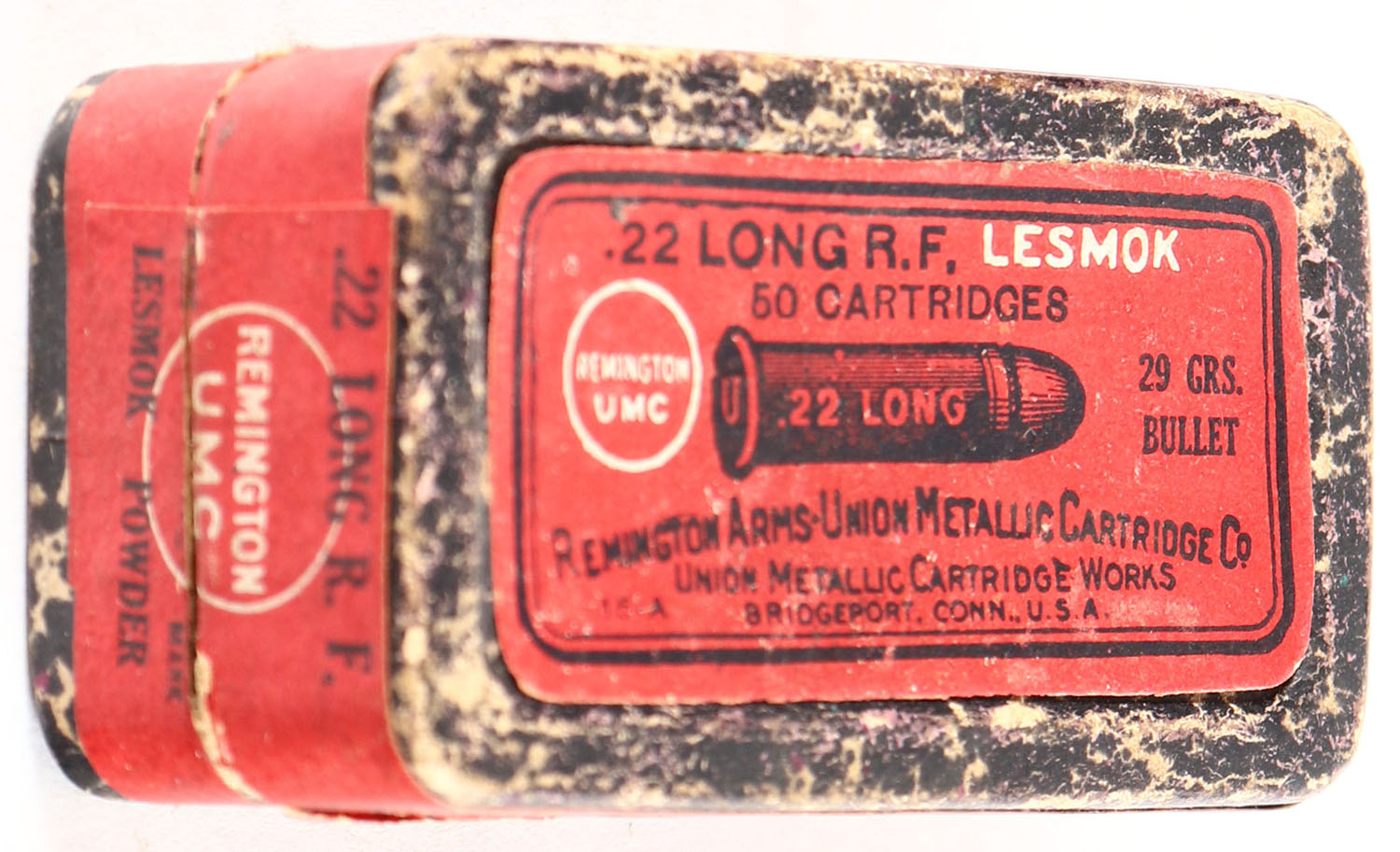 REM-UMC, R.F. Lesmok, .22 Long, RHWeb: REM-2 L-2B, Full, 2pc. Black mottled box with red top & side sealing labels, box is solid with excellent color, very minor age soiling & corner wear, edges are mostly crisp, side sealing label is sealed on back side, labels are intact, ammo is good to very good. Grade: Excellent + - Value: 30 to 90