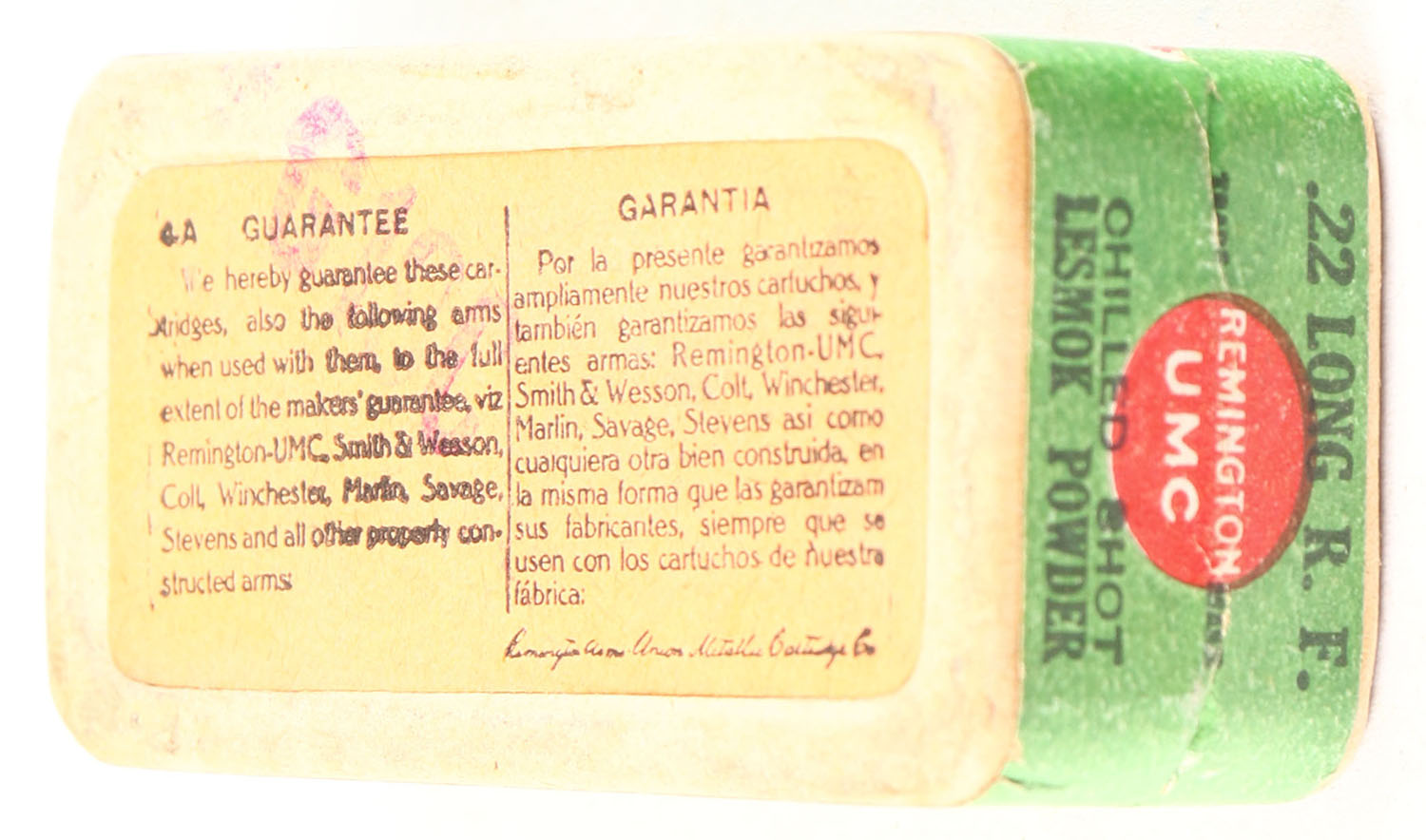 REM-UMC, R.F. Lesmok, .22 Long Shot, RHWeb: REM-2 L-4A, FULL & SEALED, 2pc. Buff box with green top & side sealing labels, box is solid with excellent color, very minor age soiling, corners are mostly sharp, edges are crisp, labels are intact. Grade: Excellent ++ - Value: 40 to 120