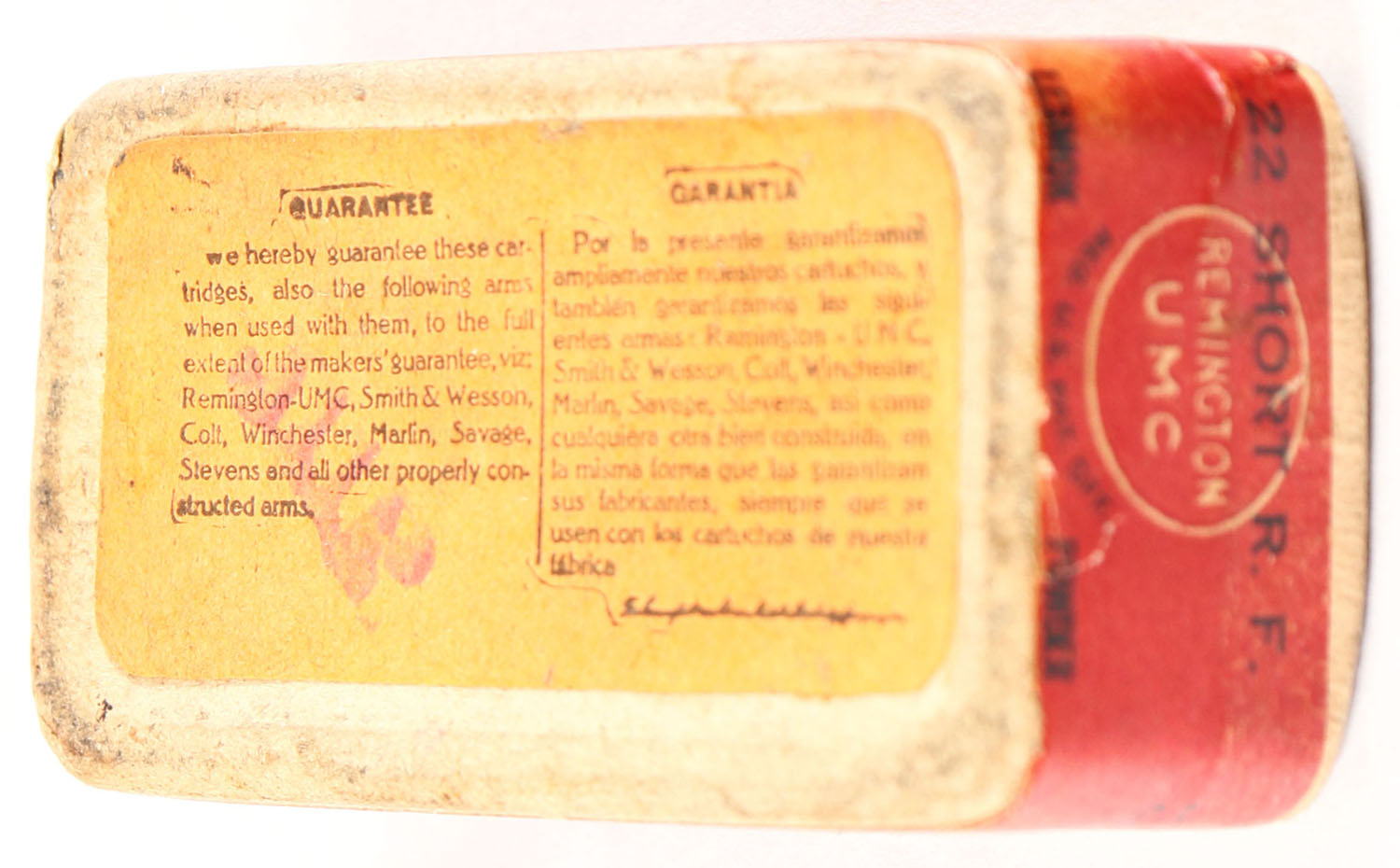 REM-UMC, R.F. Lesmok, .22 Short, RHWeb: REM-3 S-2A, Full, 1pc. Buff box with red top & side sealing labels, box is solid with very good color, some age soiling, minor edge & corner wear, labels are intact. Grade: Very Good ++ - Value: 20 to 80