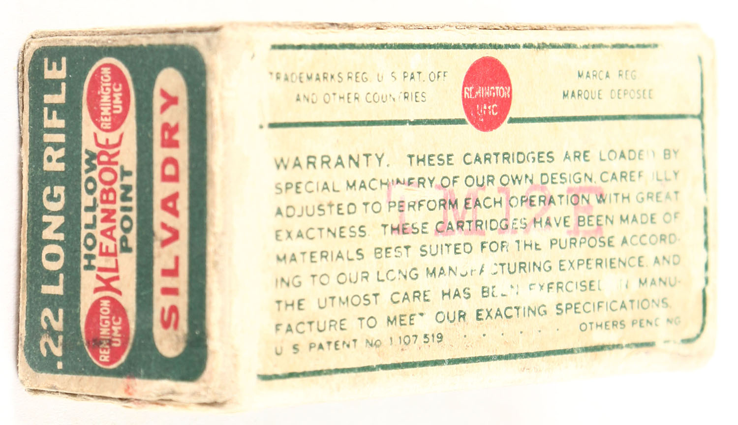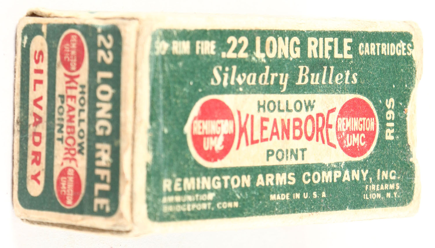 Remington, Kleanbore Silvadry Bullets, .22 Long Rifle Hollow Point, RHWeb: REM-7.3 LR-2, Full, 1pc. Green buff & red dog bone box, box is solid with excellent color, some shelf wear, corner wear, minor edge wear, end flaps are solid, ammo is very good. Grade: Very Good + - Value: 30 to 120