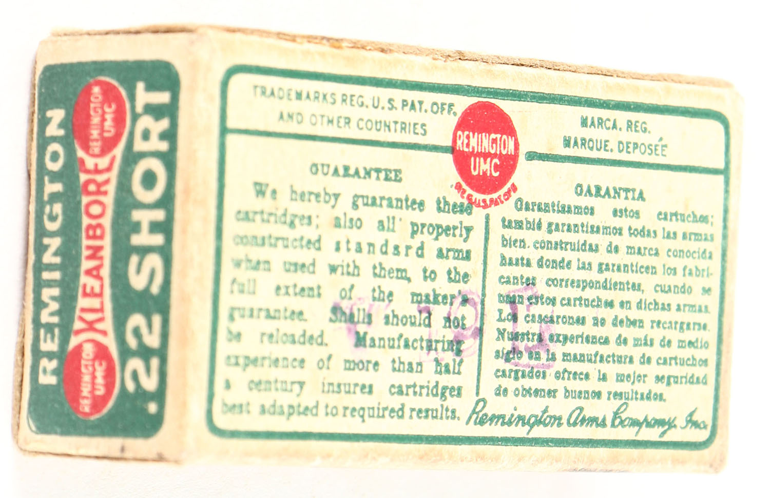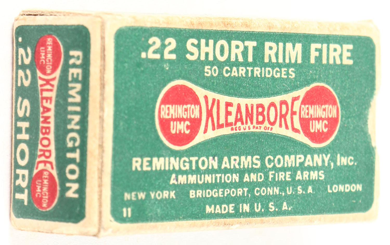 Remington, Kleanbore, .22 Short, RHWeb: REM-7.1A S-1a, Full, 1pc. Green buff & red dog bone box, box is solid with very good to excellent color, some age soiling & corner wear, edges are mostly crisp, end flaps are solid, ammo is very good. Grade: Excellent - Value: 20 to 60
