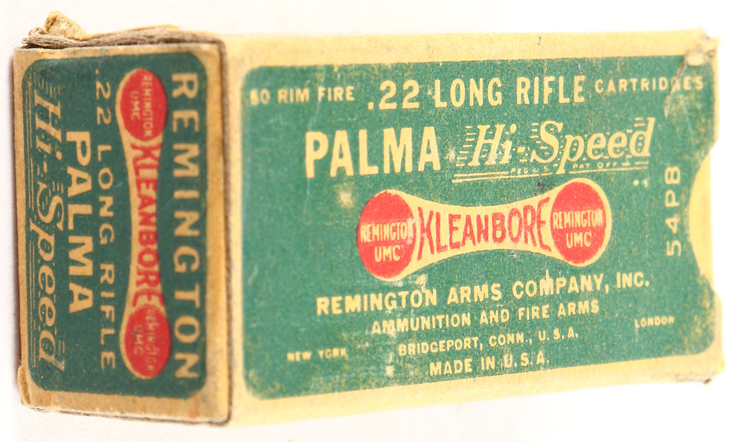 Remington, Palma Hi-Speed Kleanbore, .22 Long Rifle, RHWeb: REM-52 LR-11b, Full, 1pc. Green buff & red dog bone box, box is solid with very good color, some age soiling & shelf wear, corner wear, edges are mostly crisp, end flaps are solid, ammo is excellent. Grade: Very Good ++ - Value: 10 to 50