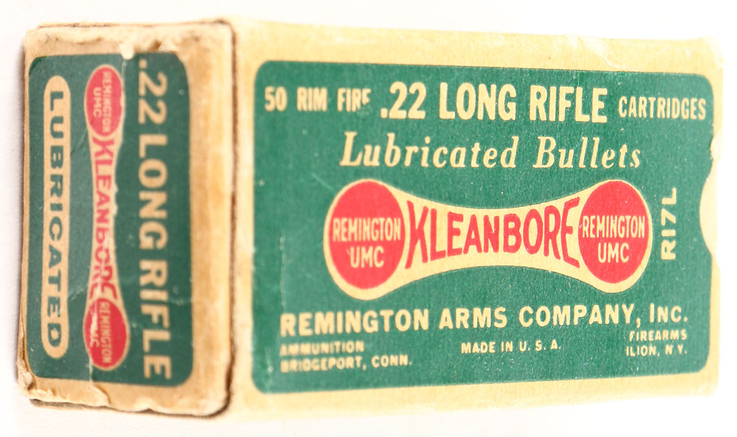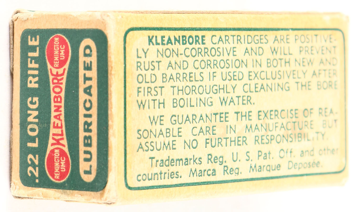 Remington, Kleanbore, .22 Long Rifle, RHWeb: REM-7.2 LR-1e, Full, 1pc. Green buff & red dog bone box, box is solid with excellent color, very minor age soiling, minor corner wear, edges are crisp, end flaps are solid, ammo is very good. Grade: Very Good ++ - Value: 8 to 40