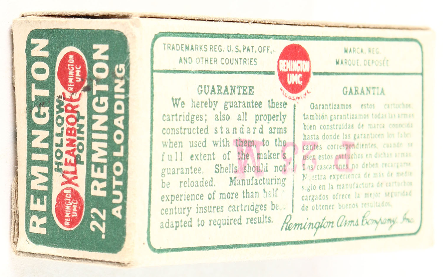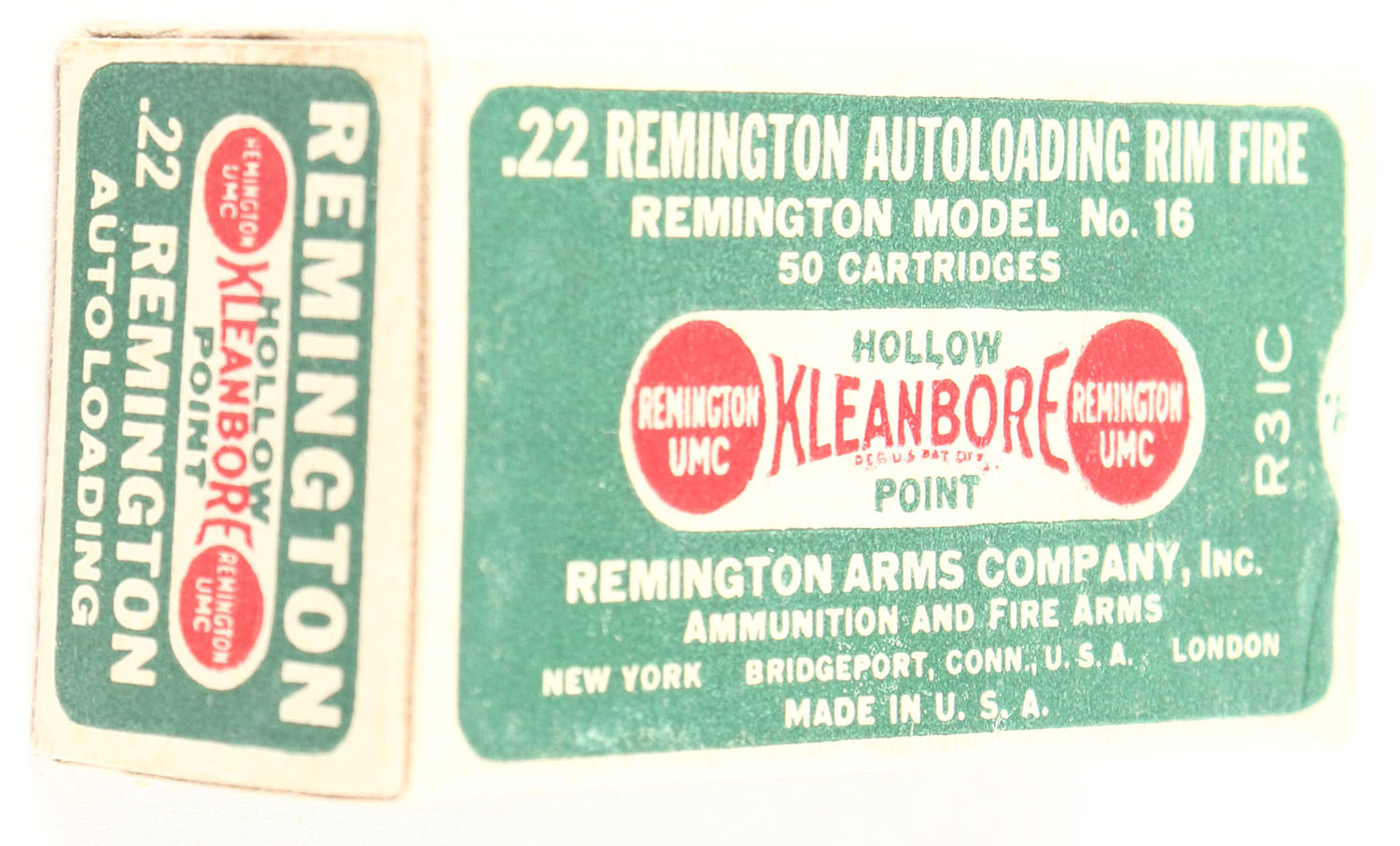Remington, Kleanbore, .22 Remington Autoloading Hollow Point, RHWeb: REM-7.1B RA-3, Full, 1pc. Green buff & red dog bone box, box is near mint with excellent to minty color, only very minor corner ding on top front corner, corners otherwise mostly sharp, edges are crisp, end flaps are solid, ammo is excellent to minty. Grade: Excellent ++ - Value: 150 to 450