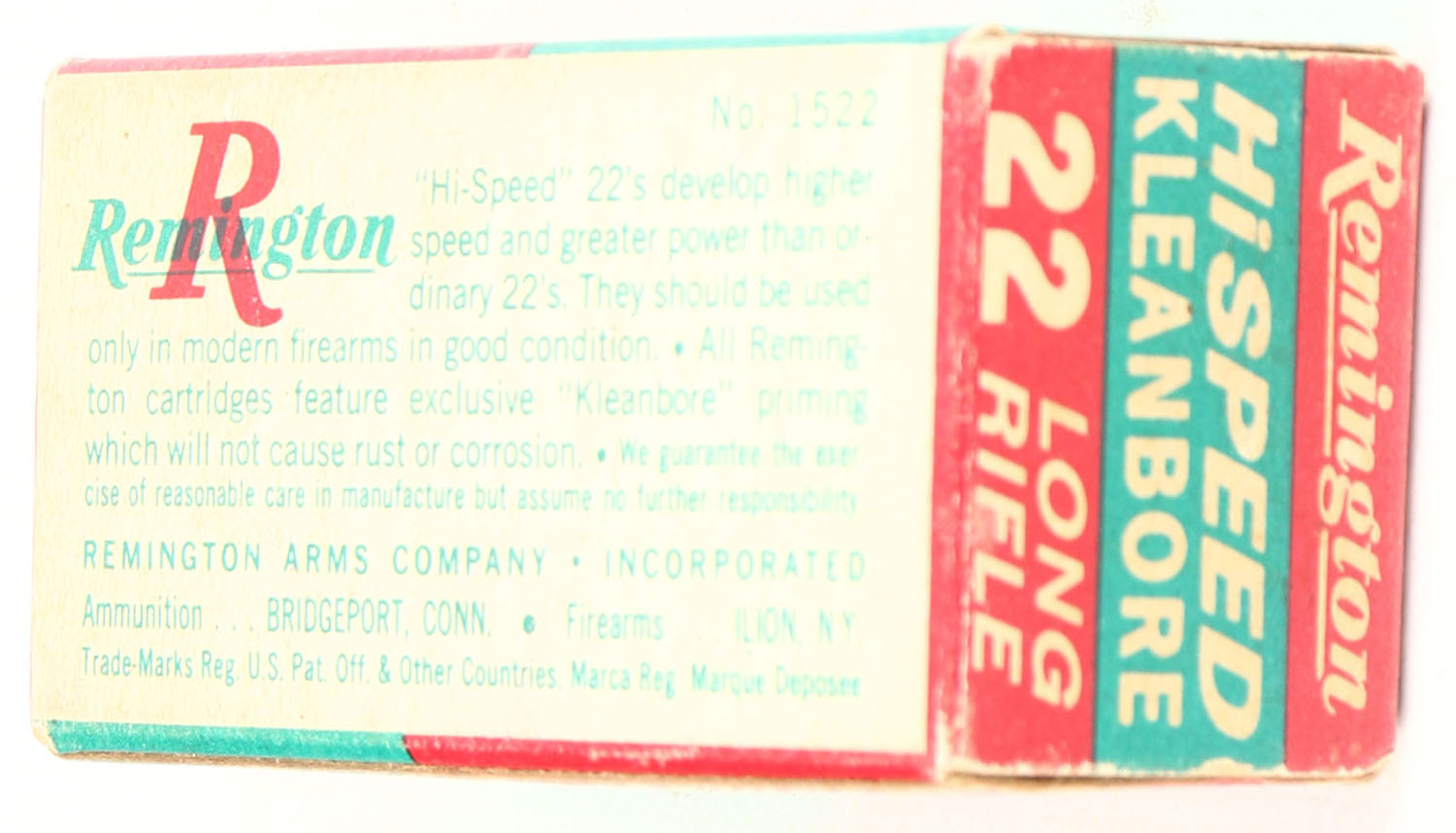 Remington, HiSpeed, .22 Long Rifle, RHWeb: REM-16 LR-1, Full, 1pc. Red green & white box, box is solid with very good to excellent color, minor age soiling & corner wear, top has been written on, edges are mostly crisp, end flaps are solid, ammo is excellent. Grade: Very Good ++ - Value: 4 to 20