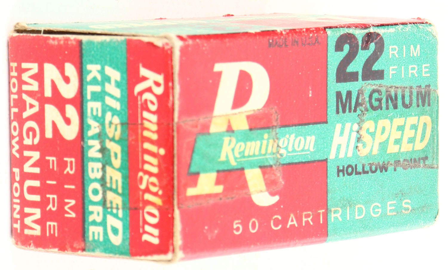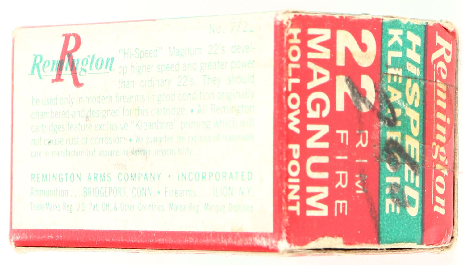 Remington, HiSpeed, .22 Magnum Rim Fire Hollow Point, RHWeb: REM-15 WMR-1, Full, 1pc. Red green & white box, box is solid with excellent color, very minor age soiling, tape on both end flaps, some corner wear, very minor edge wear, end flaps are solid, ammo is excellent. Grade: Very Good ++ - Value: 10 to 50