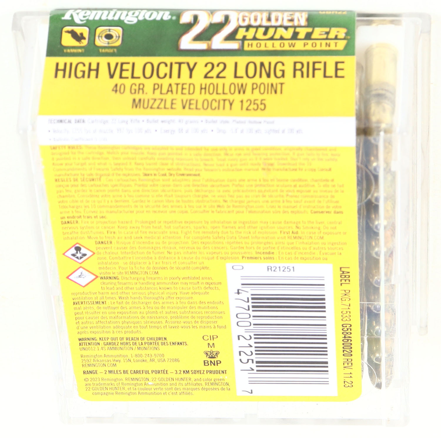 Remington, Golden Hunter, .22 Long Rifle Hollow Point, 40 Grain Plated H.P., 1255 FPS, FULL & SEALED, 2pc. Clear plastic tray with green sealing label, box is MINT with mint color, ammo appears mint. Grade: MINT - Value: 14 to 28