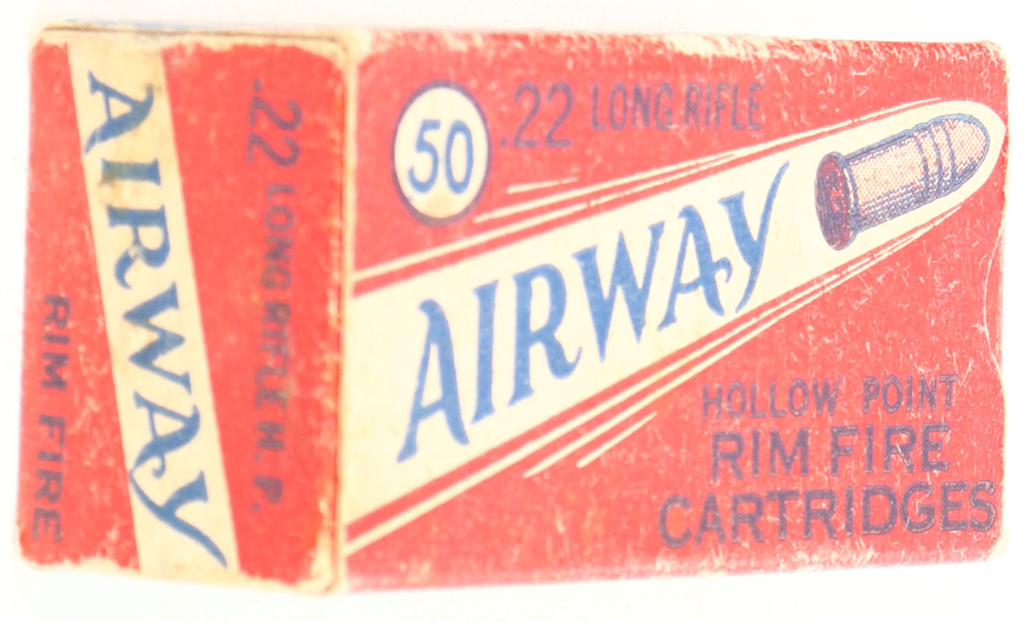 Gambles, Airway, .22 Long Rifle Hollow Point, RHWeb: GS-1 LR-2a, Full, 1pc. Red blue & white box, box is solid with excellent color, minor age soiling & shelf wear, minor edge & corner wear, end flaps are solid, ammo is excellent. Grade: Excellent - Value: 50 to 150