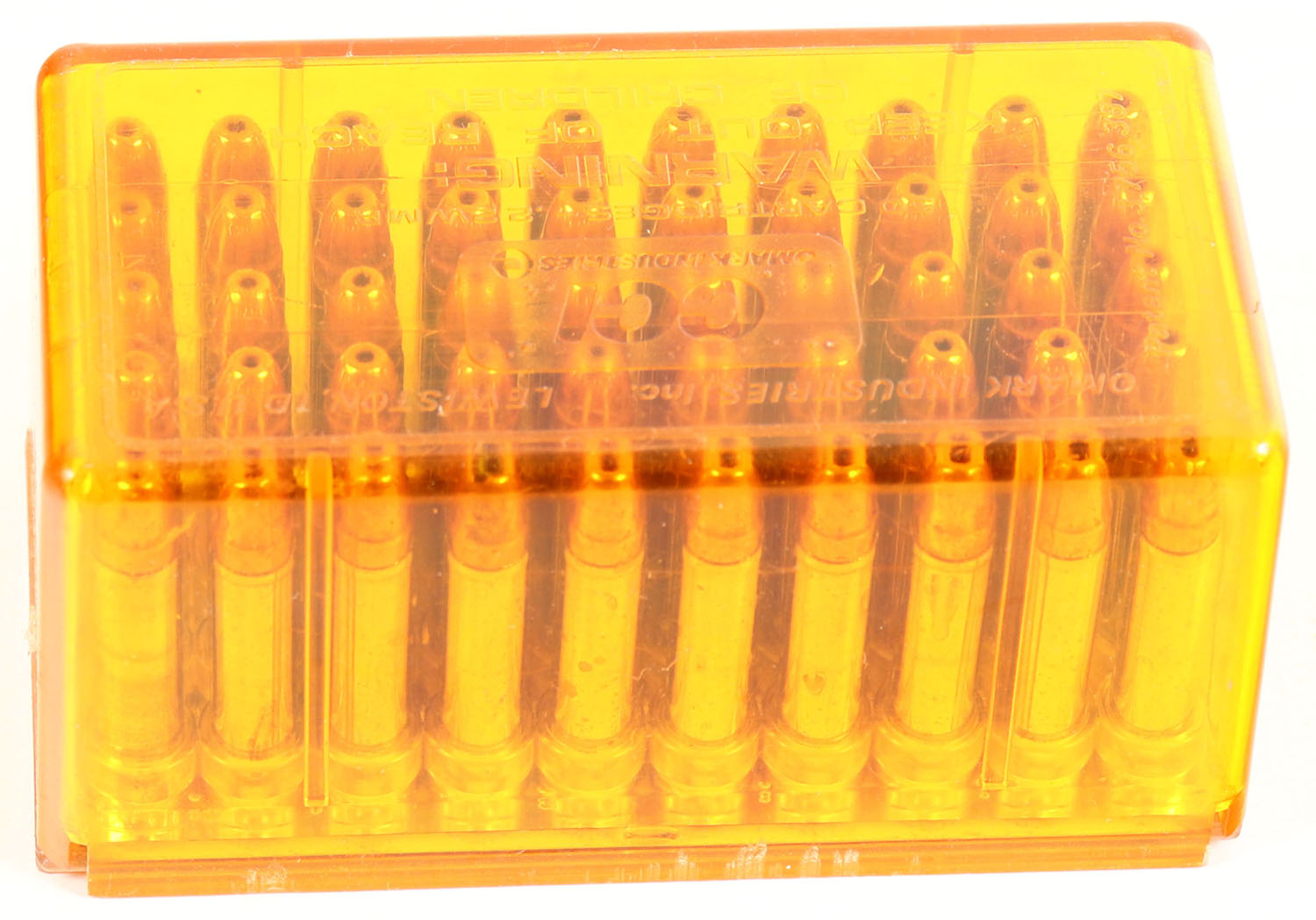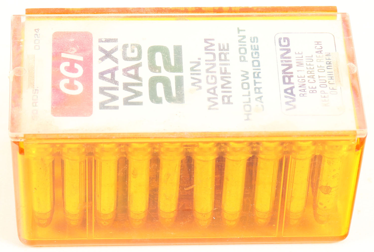CCi, Maxi Mag, .22 Winchester Magnum Rimfire Hollow Point, Full, 2pc. Amber plastic tray with white label, box is solid, plastic is dirty, ammo is minty. Grade: Excellent ++ - Value: 2 to 40