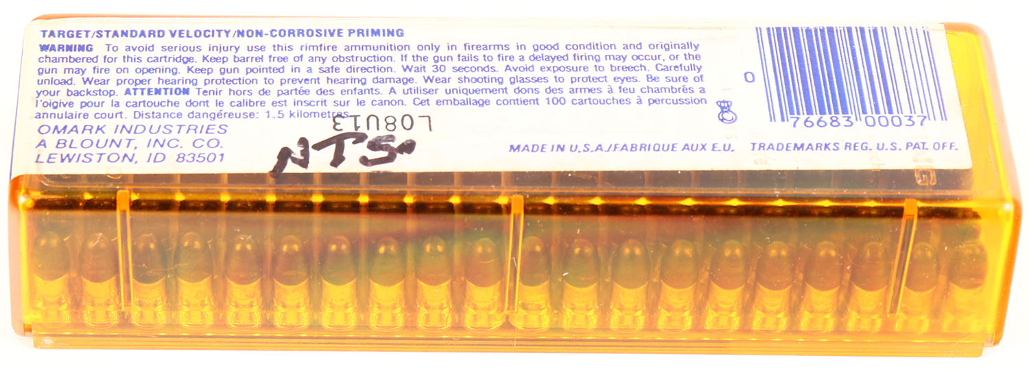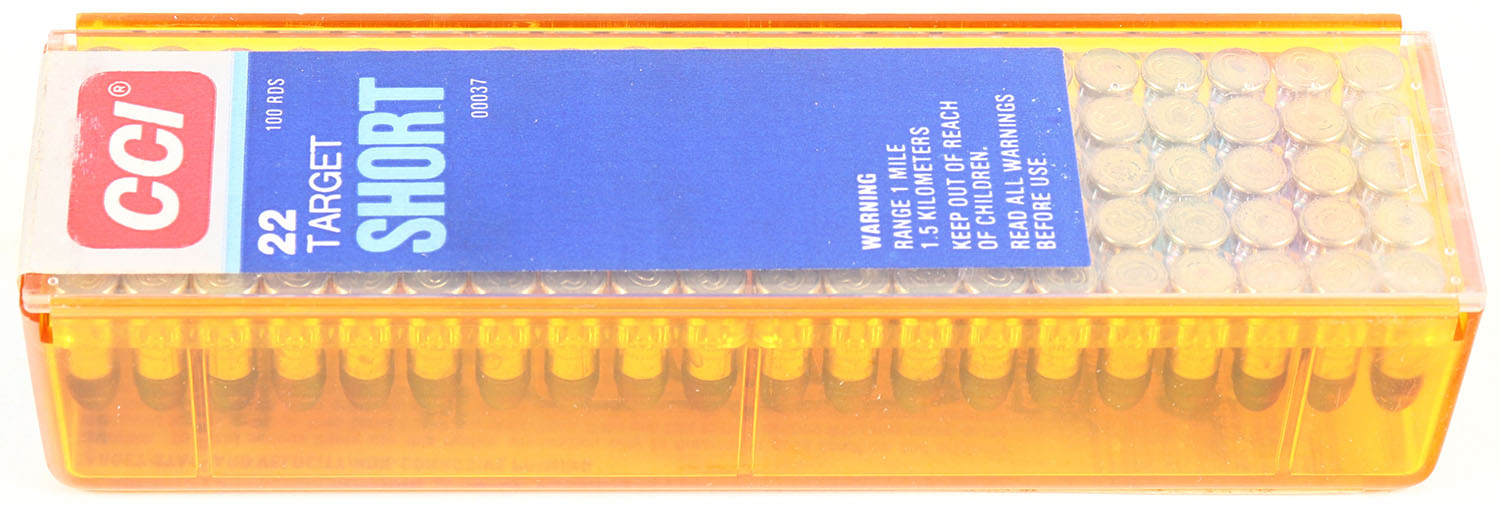 CCi, Target, .22 Short, Standard Velocity, RHWeb: CCI-6.1 S-3, FULL & SEALED, 2pc. Amber plastic tray with blue & silver sealing label, box is solid, label is intact with excellent color, very minor age soiling, ammo appears mint. Grade: Excellent + - Value: 10 to 40