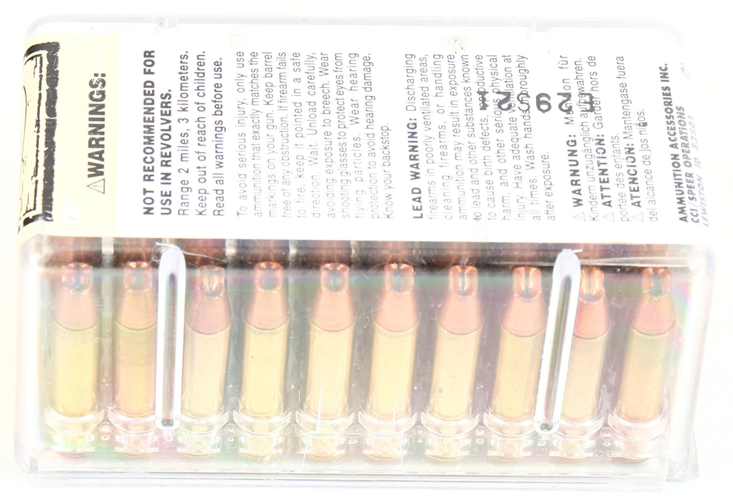 CCi, .22 WRF Hollow Point, FULL & SEALED, 2pc. Clear plastic tray with tan sealing label, box and label are mint, ammo appears minty. Grade: MINT - Value: 10 to 40