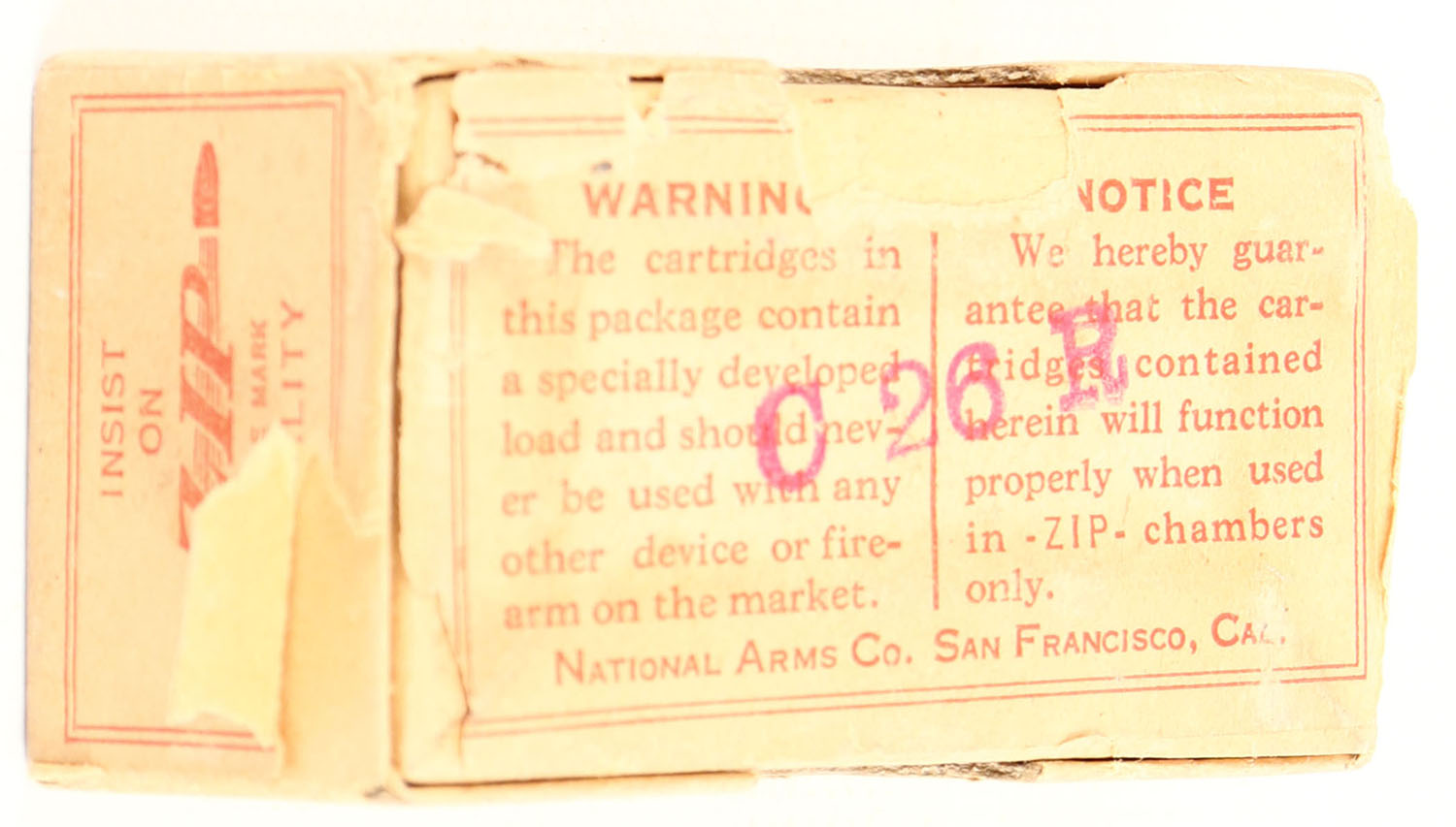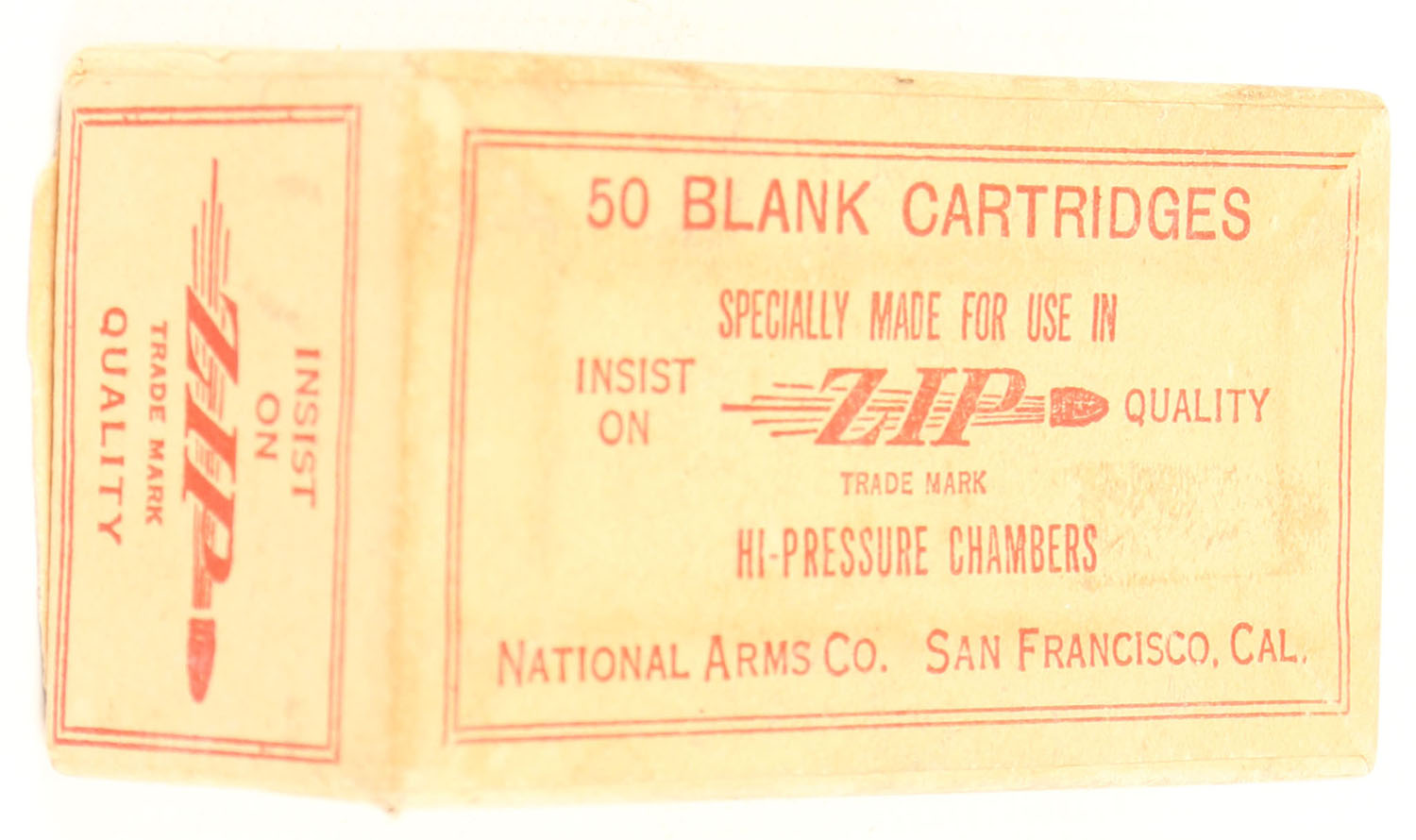 National Arms Co., Blank Cartridges, Specially Made For Use in Zip Hi-Pressure Chambers, Not in RHWeb, FULL & SEALED, 2pc. Buff box with buff & red wraparound label, box is solid with very good to excellent color, some age soiling, very minor edge & corner wear, label is intact and unsealed on right end. Grade: Excellent + - Value: 10 to 50