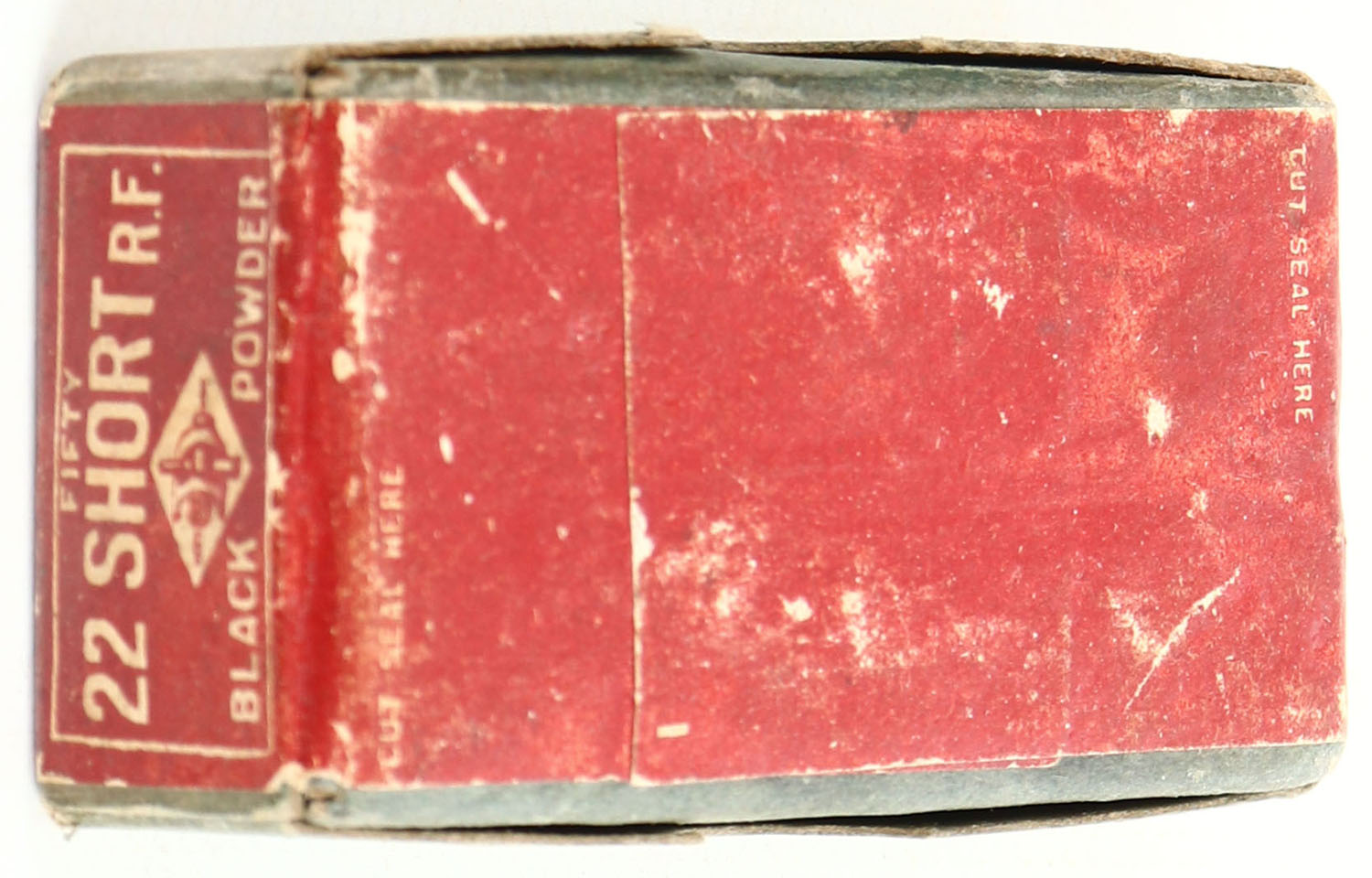Dominion, Black Powder, .22 Short, RHWeb: D-3 S-2a, FULL & SEALED, 2pc. Green box with red & white wraparound label, box is solid with excellent color, some shelf wear, minor corner wear, edges are crisp, label is intact. Grade: Excellent + - Value: 100 to 300