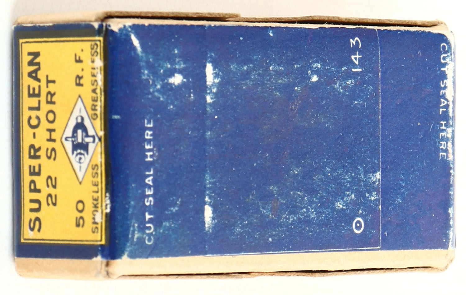 Dominion, Super-Clean, .22 Short, Smokeless Greaseless, RHWeb: D-4 S-2, FULL & SEALED, 2pc. Buff box with yellow & blue wraparound label, box is near mint with minty color, only very minor corner ding on top front corner, very minor shelf wear on bottom, corners are otherwise sharp, edges are crisp, label is intact. Grade: Excellent ++ - Value: 50 to 150