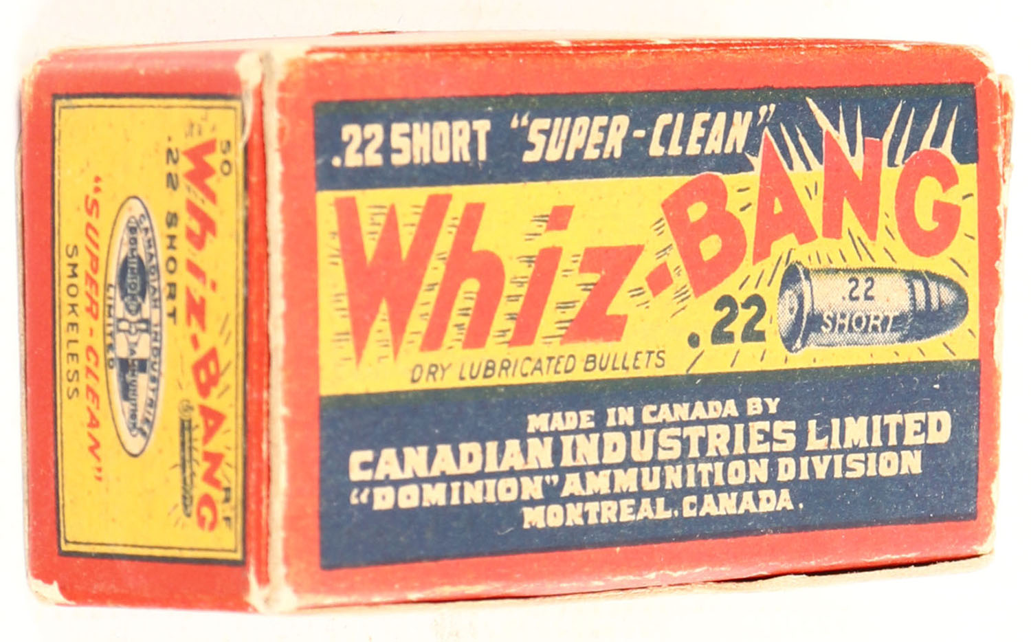 C.I.L., Whiz-Bang, .22 Short, Super-Clean, RHWeb: CIL-2 S-4b, Full, 1pc. Yellow red & blue box, box is solid with very good to excellent color, minor age soiling & corner wear, very minor edge wear, top flap is solid, ammo is excellent. Grade: Excellent + - Value: 2 to 60