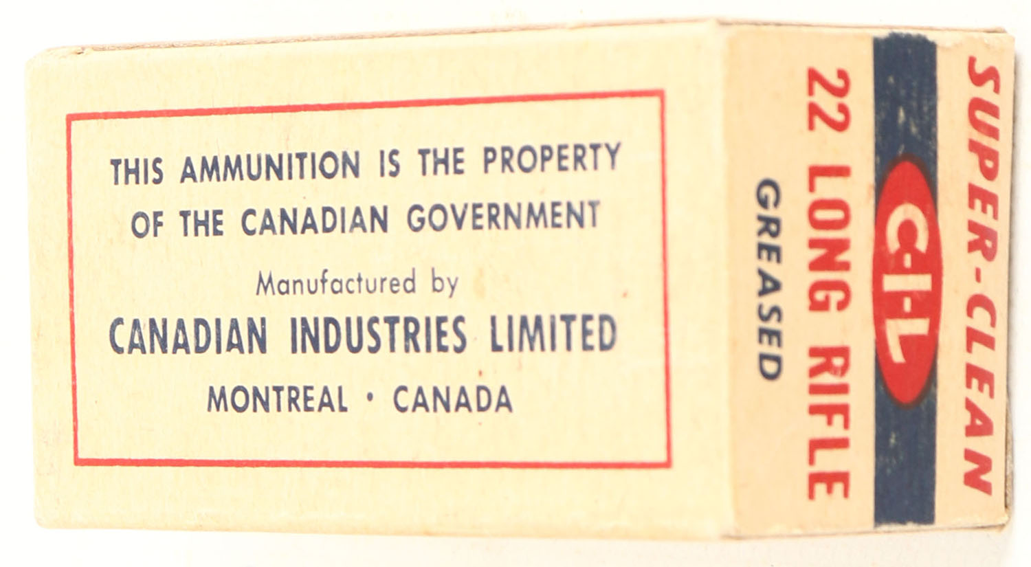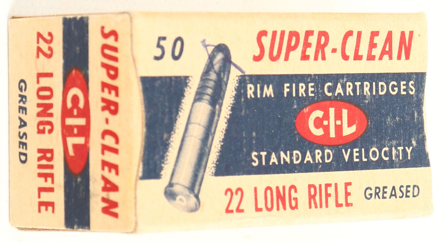 C.I.L., Super-Clean, .22 Long Rifle, Standard Velocity, Greased, RHWeb: CIL-3 LR-4d, Full, 1pc. Buff blue & red box, box is near mint with minty color, only top has been written on, corners are sharp, edges are crisp, end flaps are solid, ammo is very good. Grade: Excellent ++ - Value: 10 to 50