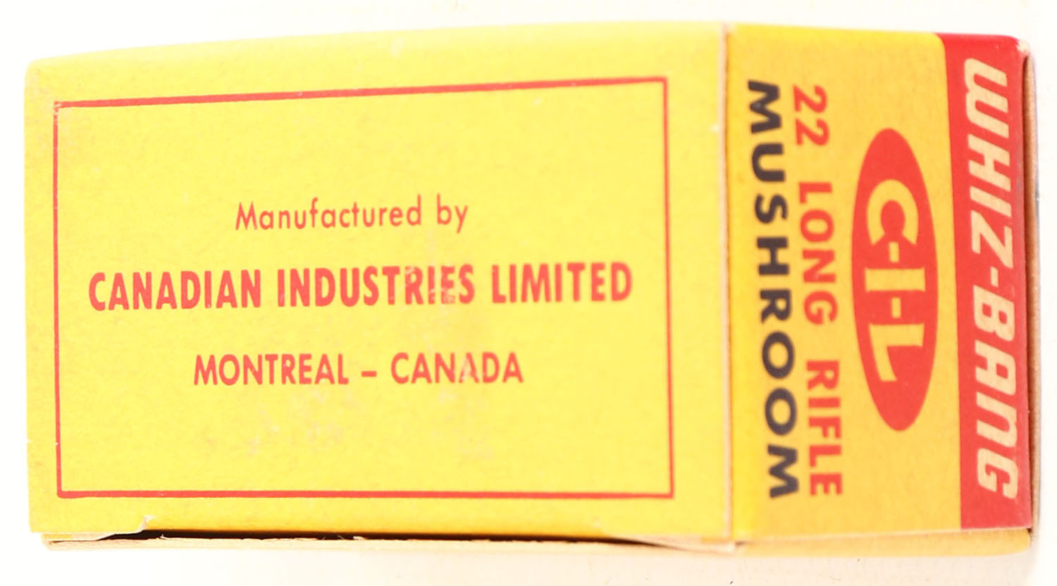 C.I.L., Whiz-Bang, .22 Long Rifle Mushroom, RHWeb: CIL-5 LR-2, Full, 1pc. Yellow & red box, box is MINT with minty color, corners are sharp, edges are crisp, top flap is solid, ammo is excellent. Grade: MINT - Value: 10 to 50