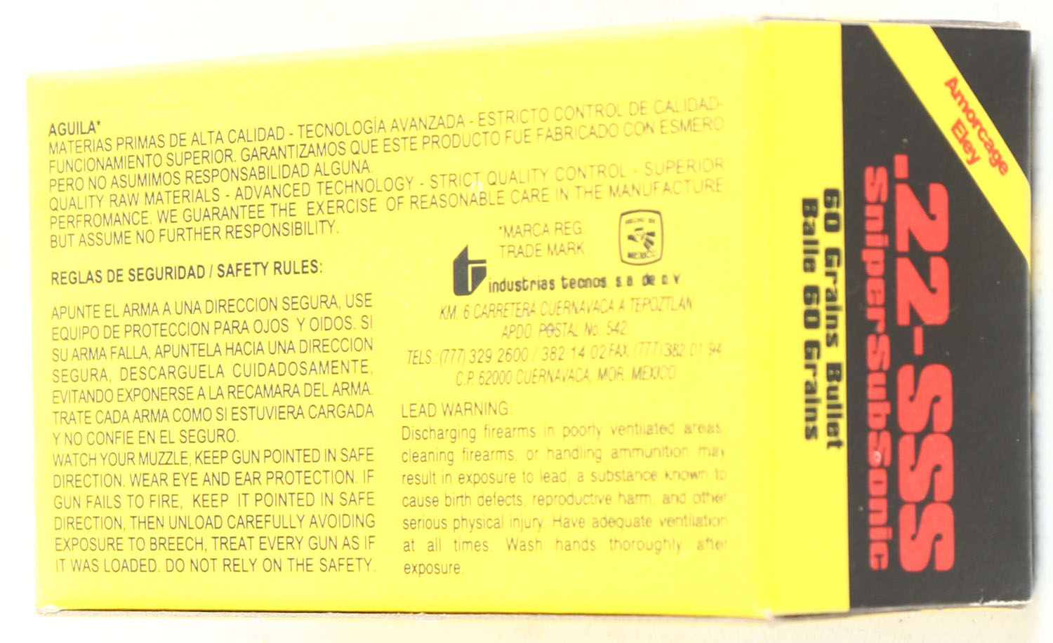 Aguila, SniperSubSonic, .22 Long Rifle, 60 Grain Bullet in a .22 short case, RHWeb: IT-9 LR-2, Full, wpc. Black yellow & red box, box is MINT with mint color, corners are sharp, edges are crisp, end flaps are solid, ammo is minty. Grade: MINT - Value: 10 to 50