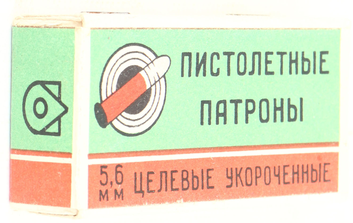 Unknown Mfg., Pistol Cartridges, .22 Short, Short Target, Non-Rusting, RHWeb: (USSR) NAT-1 S-2, Full, 1pc. Green red & white box, box is solid with excellent color, minor age soiling, very minor corner wear, edges are crisp, end flaps are solid, ammo is excellent. Grade: Excellent + - Value: 10 to 50