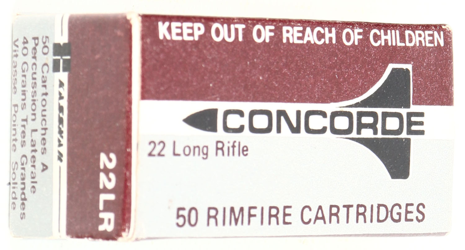 Arms Corporation of the Philippines, Concorde, .22 Long Rifle, RHWeb: (Philippines) AC-2 LR-2, Full, 1pc. Gray purple & white box, box is near mint with minty color, only very minor corner wear, edges are crisp, end flaps are solid, ammo is minty. Grade: Excellent ++ - Value: 10 to 50