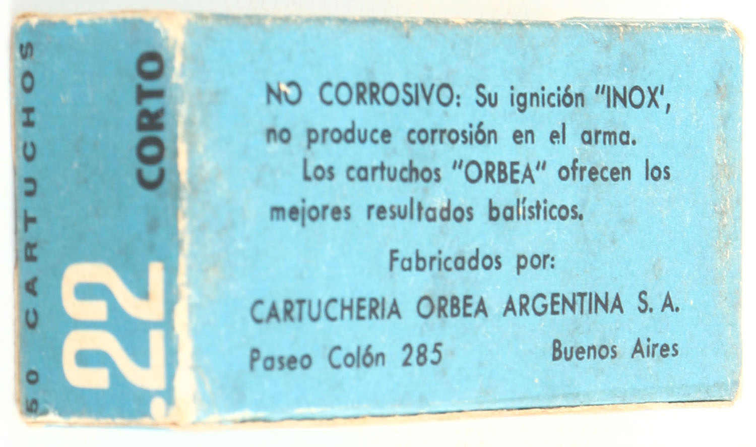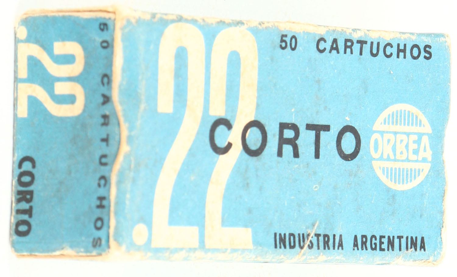 Orbea, .22 Short, Non-Corrosive, RHWeb: (Argentina) OR-2 S-1, Full, 1pc. Blue white & black box, box is solid with very good color, some age soiling, some edge & corner wear, end flaps are solid, ammo is excellent. Grade: Very Good + - Value: 8 to 40