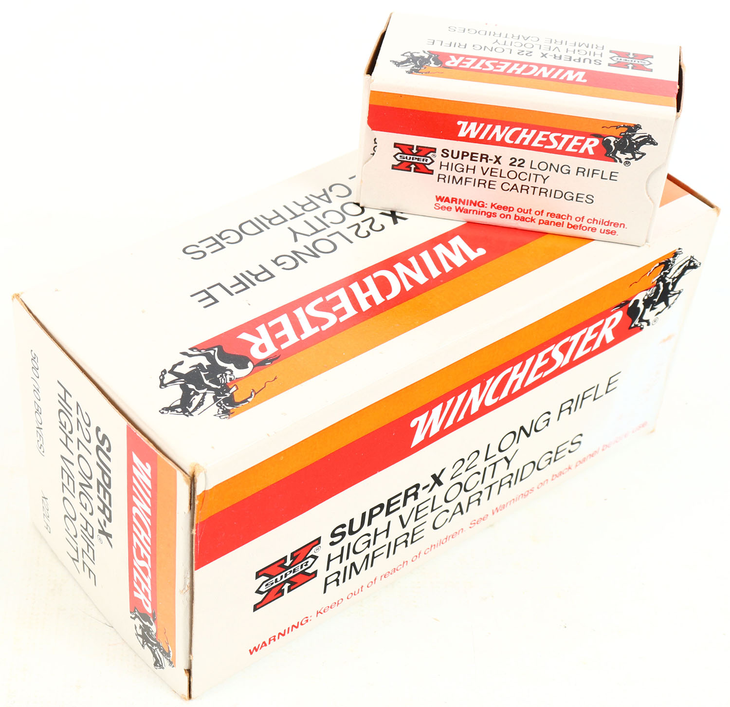 Winchester, Super-X, .22 Long Rifle, High Velocity, Full, 500rds. 1pc. Gray red & orange brick, brick is solid with minty color, very minor shelf & corner wear, edges are crisp, end flaps are solid, inside boxes are mint. Grade: Excellent + - Value: 40 to 120