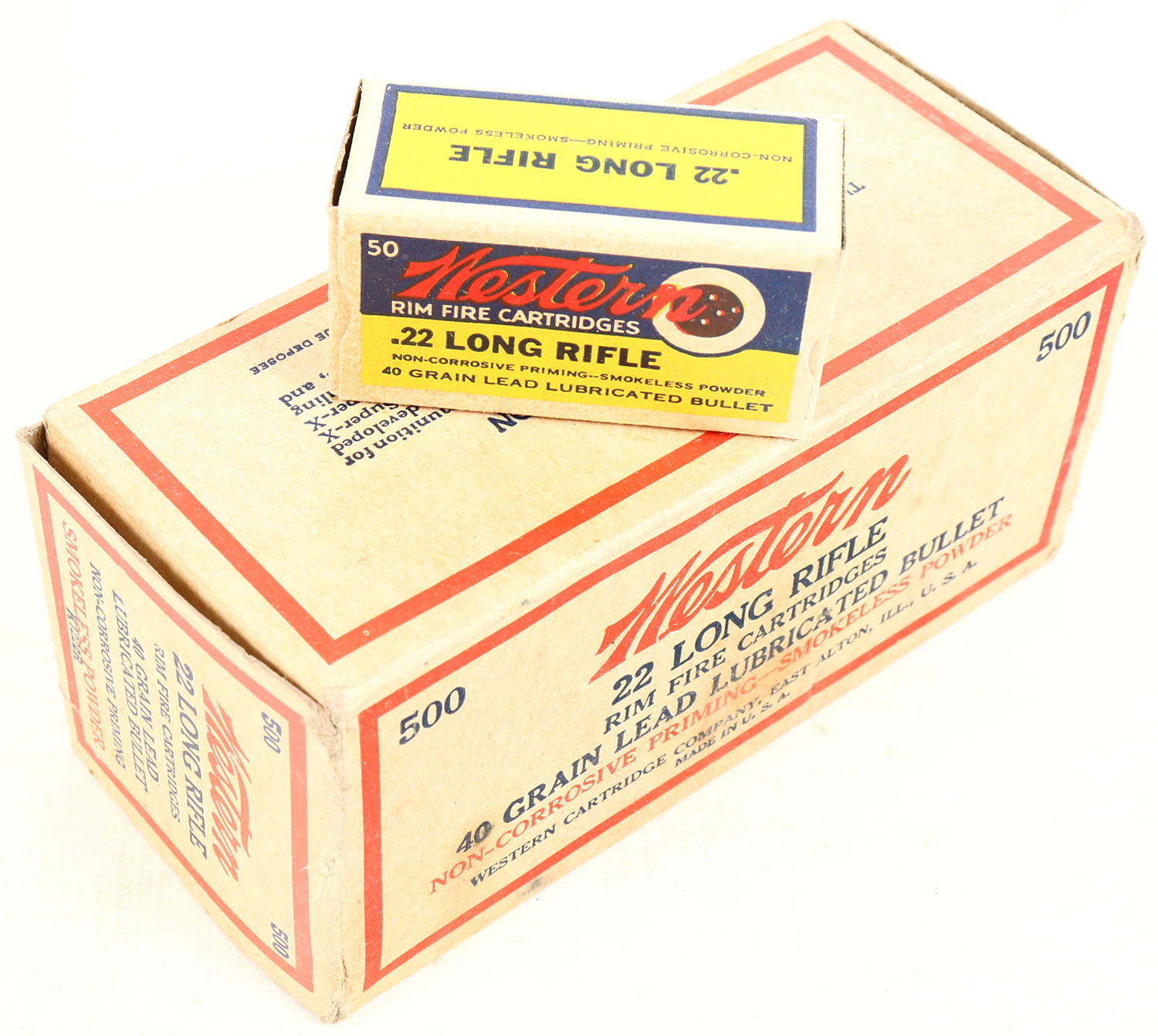 Western, Rim Fire Cartridges, .22 Long Rifle, Partial 9 boxes, 1pc. Buff & red brick, brick is solid with very good color, some age soiling, minor staining, some corner wear, minor edge wear, end flaps are solid, inside boxes are excellent. Grade: Very Good ++ - Value: 100 to 400