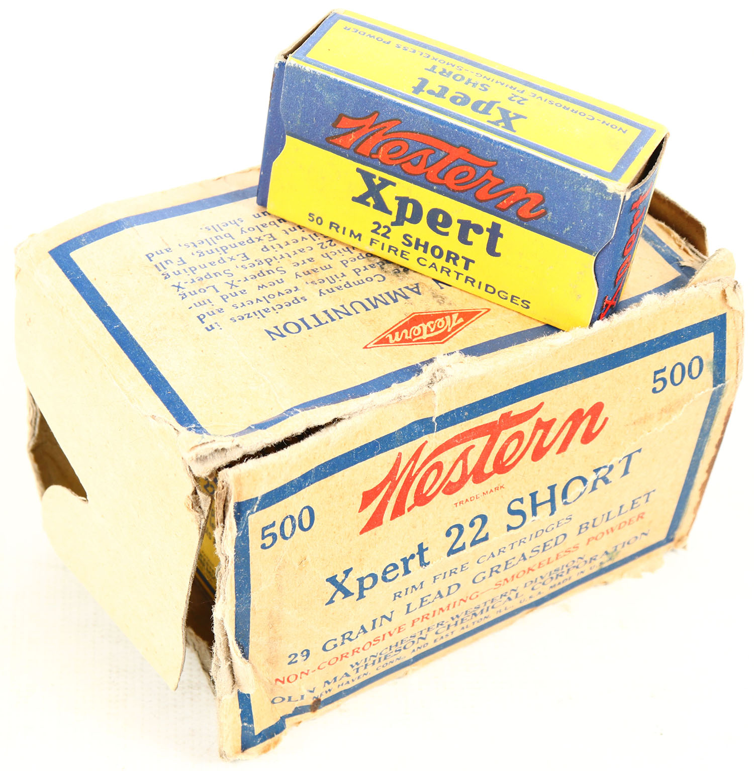 Western, Xpert, .22 Short, Greased, Partial 7 boxes, 1pc. Buff blue & red box, box is missing left end flap, has several tears & partial seam splits, staining, inside boxes are excellent. Grade: Poor ++ - Value: 20 to 60
