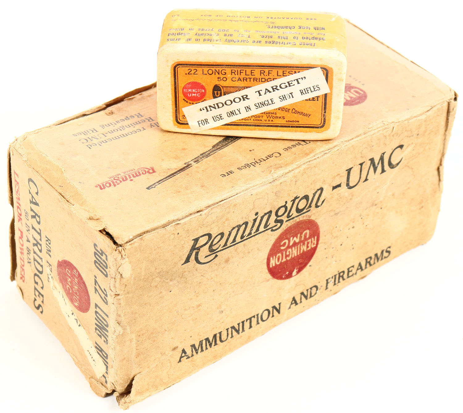 RARE! REM-UMC, ''Indoor Target'', .22 Long Rifle, R.F. Lesmok, Full, 500rds. 1pc. Buff black & red brick, brick is solid with very good color, ''Indoor Target'' over-label on left end as well as on all inside boxes, Remington-UMC label printed upside down, some age soiling, very minor staining, tear on bottom, partial seam split to right end flap, factory seam has unadhered, edge & corner wear, over-label on end flap is 25% intact, inside boxes are excellent to minty. Grade: Good ++ - Value: 500 to 2500