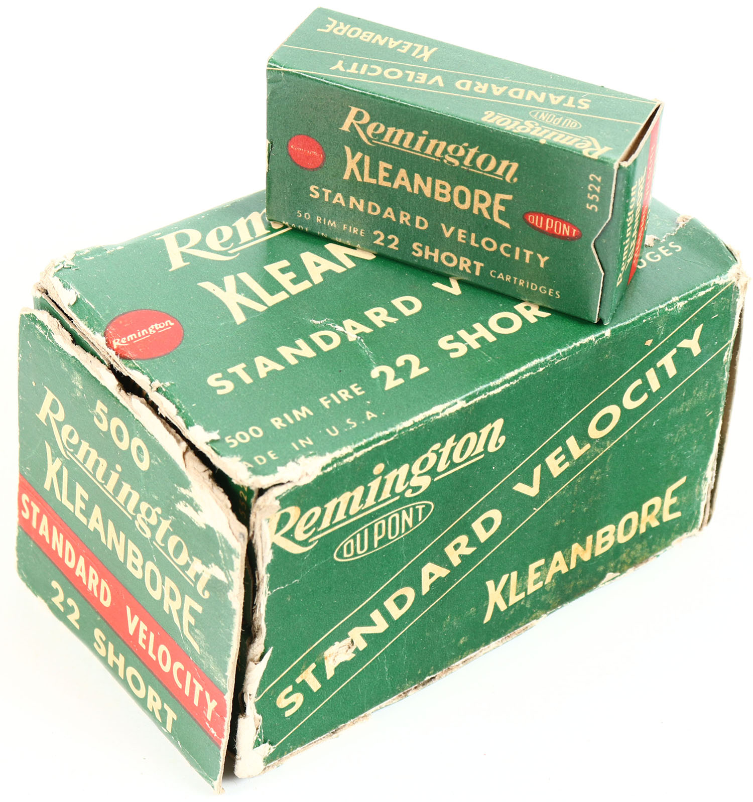 Remington, Kleanbore Standard Velocity, .22 Short, Full, 500rds. 1pc. Green white & red brick, both end flaps are torn, several partial seam splits, excellent color, very minor age soiling edge & corner wear, inside boxes are excellent. Grade: Fair - Value: 50 to 200