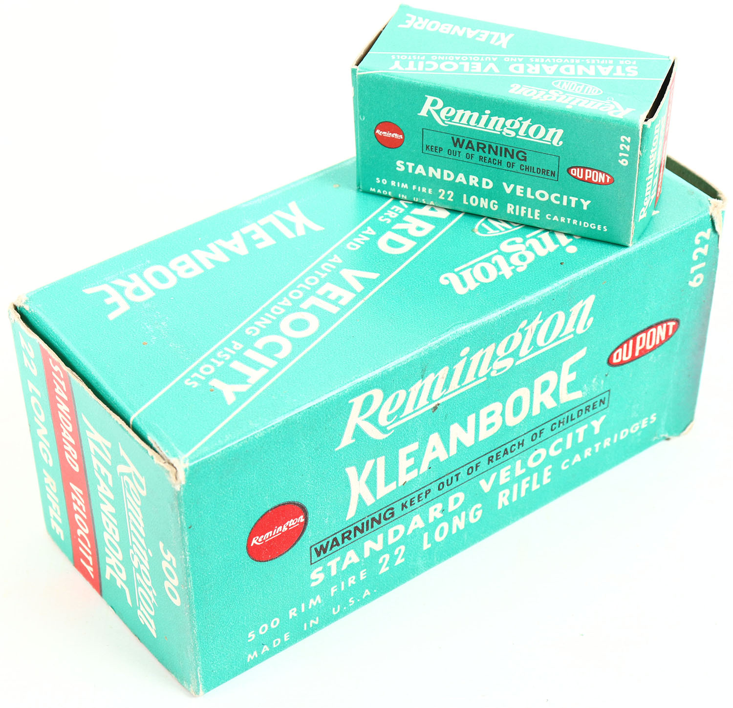 Remington, Kleanbore Standard Velocity, .22 Long Rifle, Full (10 boxes, 1 box is partial), 1pc. Green white & red brick, brick is solid with excellent color, minor shelf & corner wear, edges are crisp, end flaps are solid, inside boxes are minty. Grade: Excellent - Value: 30 to 90