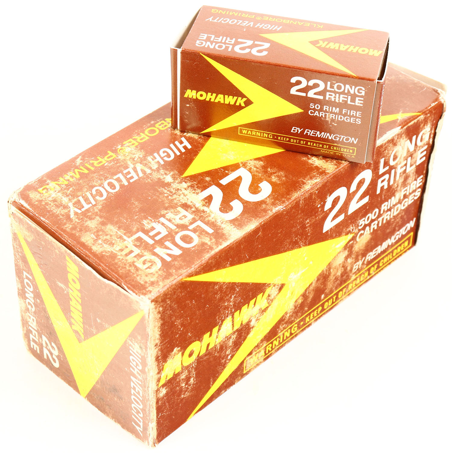 Remington, Mohawk, .22 Long Rifle, Partial 9 boxes, 1pc. Brown yellow & white brick, brick is solid with good to very good color, heavy shelf wear, some edge & corner wear, end flaps are solid, inside boxes are excellent. Grade: Very Good - Value: 30 to 90