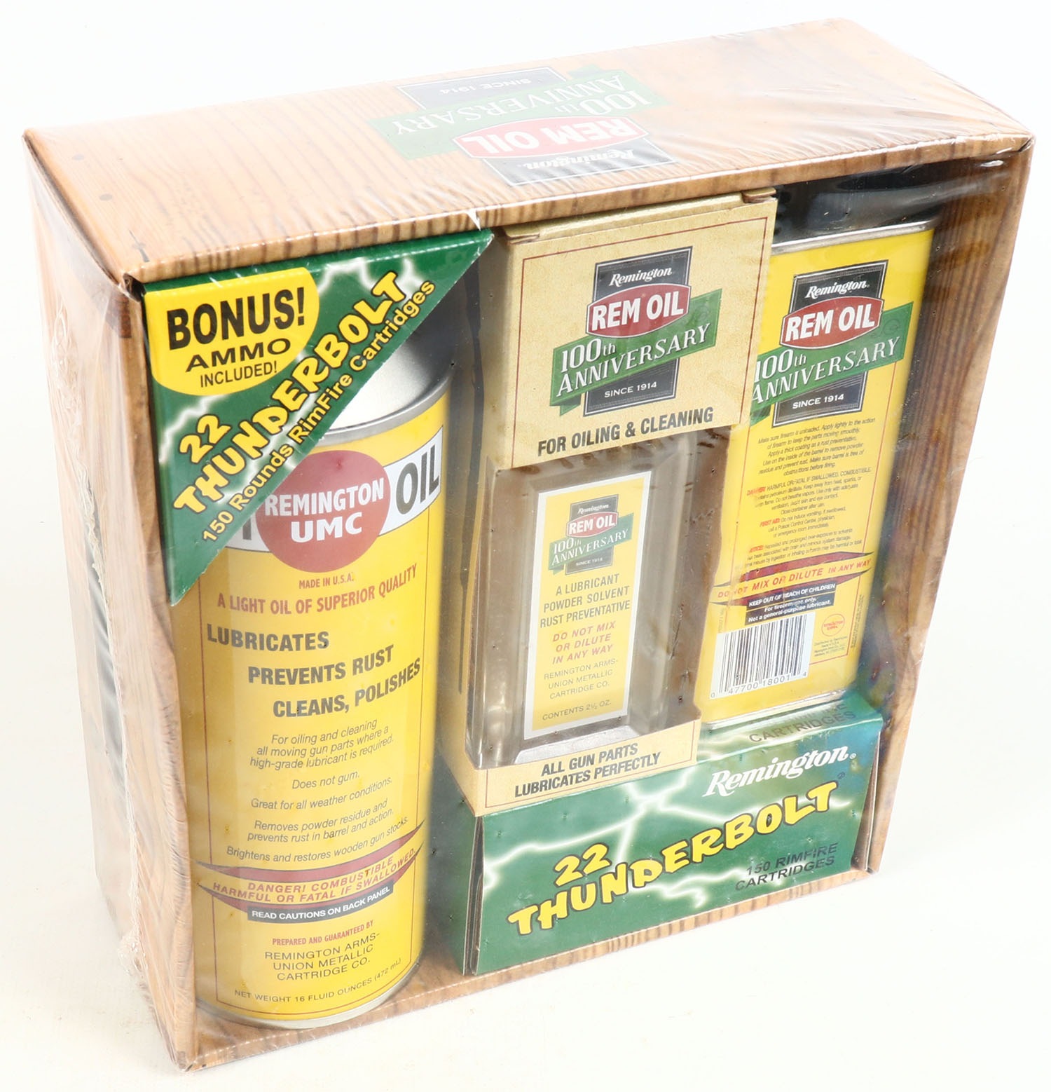 Remington, 100th Anniversary Rem Oil/Thunderbolt Promotional Box, .22 Long Rifle, FULL & SEALED, 150rds., oil can, oil tin, oil bottle. Grade: MINT - Value: 20 to 60