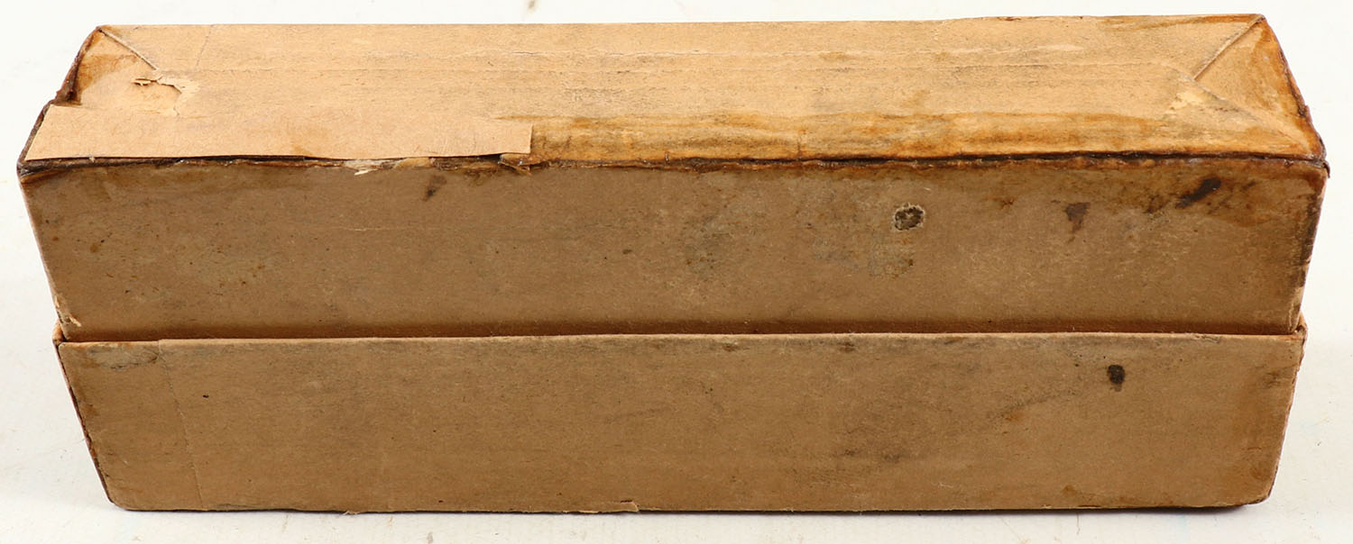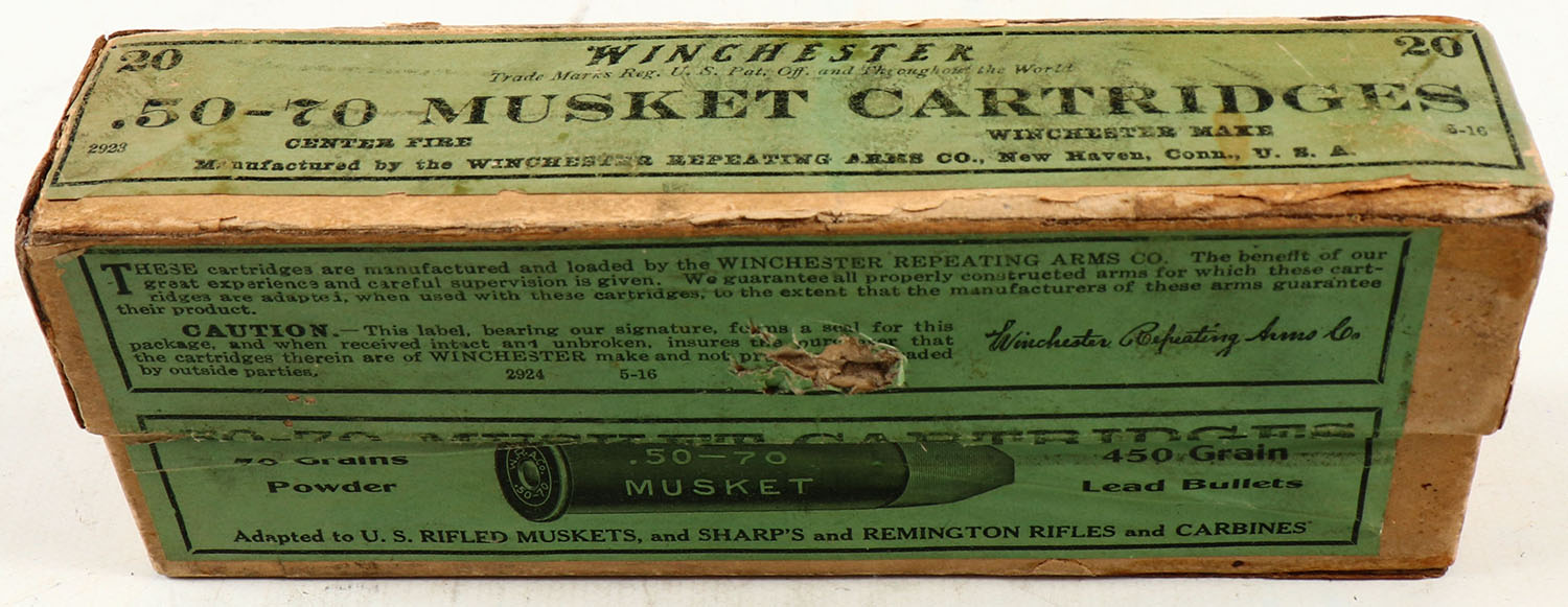 Winchester, .50-70 Musket Cartridges, 70 Grains Powder, 450 Grain Lead Bullets, Full, 2pc. Buff box with green labels, box is solid with very good color, minor age soiling & color fading, puncture in front, some edge & corner wear, labels are intact, ammo is very good to excellent. Grade: Very Good + - Value: 100 to 300